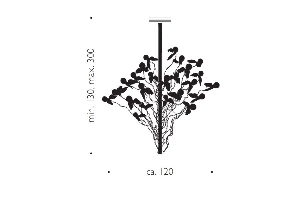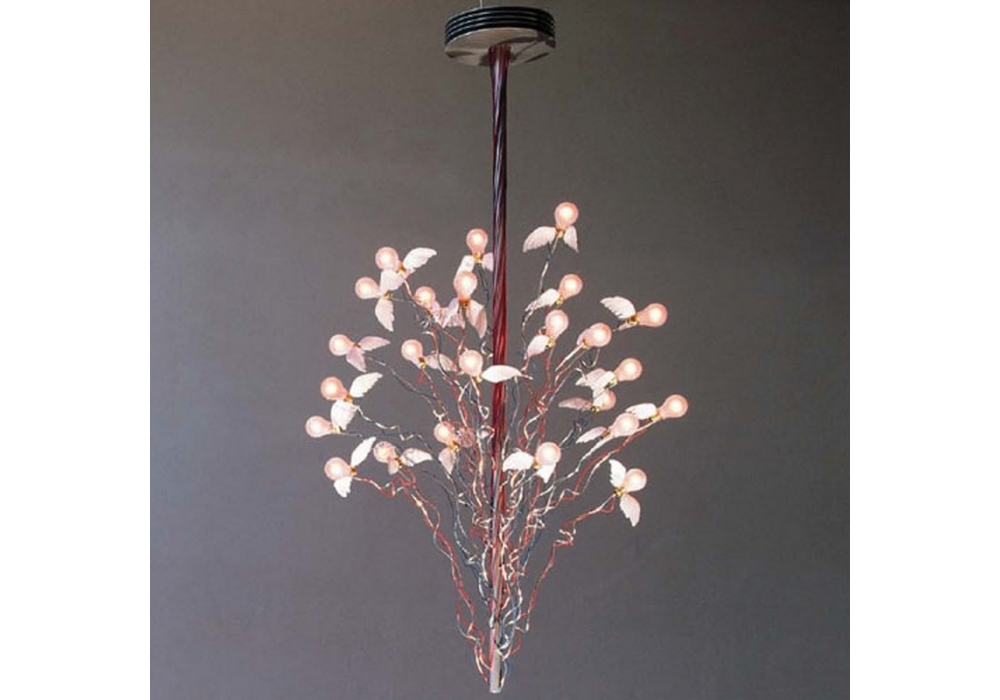 Birds Birds Birds designed and produced by Ingo Maurer is a suspension lamp with 24 winged LED bulbs with goose feathers. The bulbs are individually adjustable.