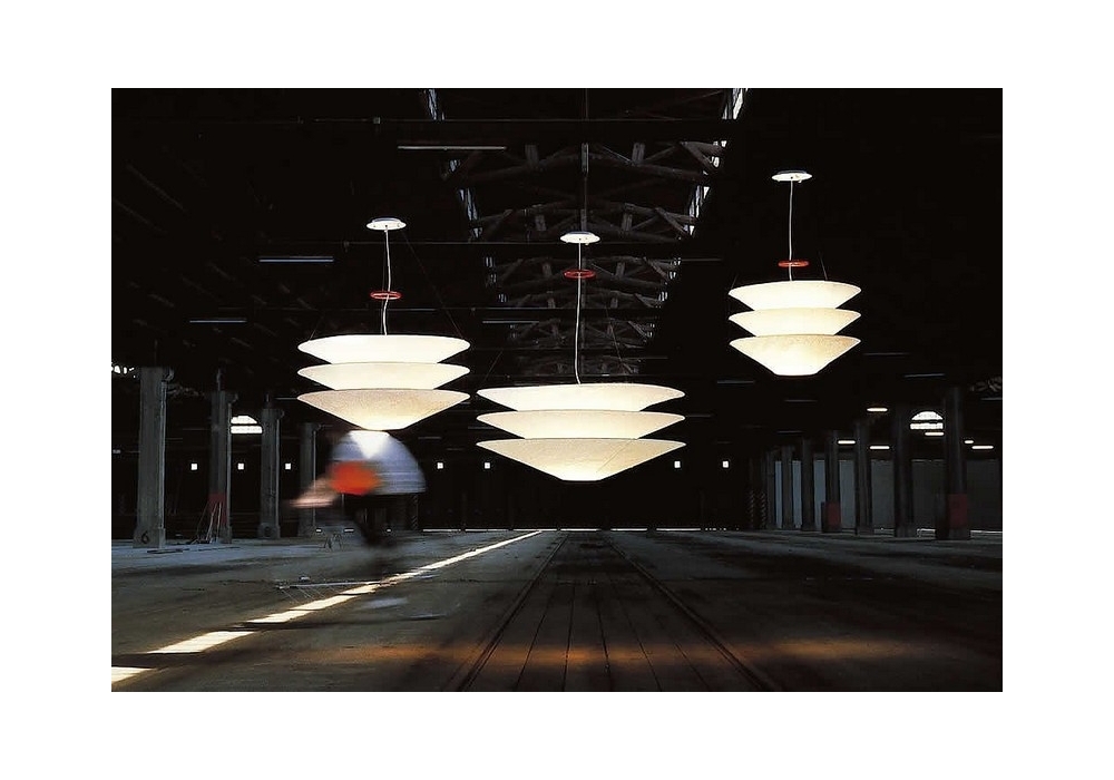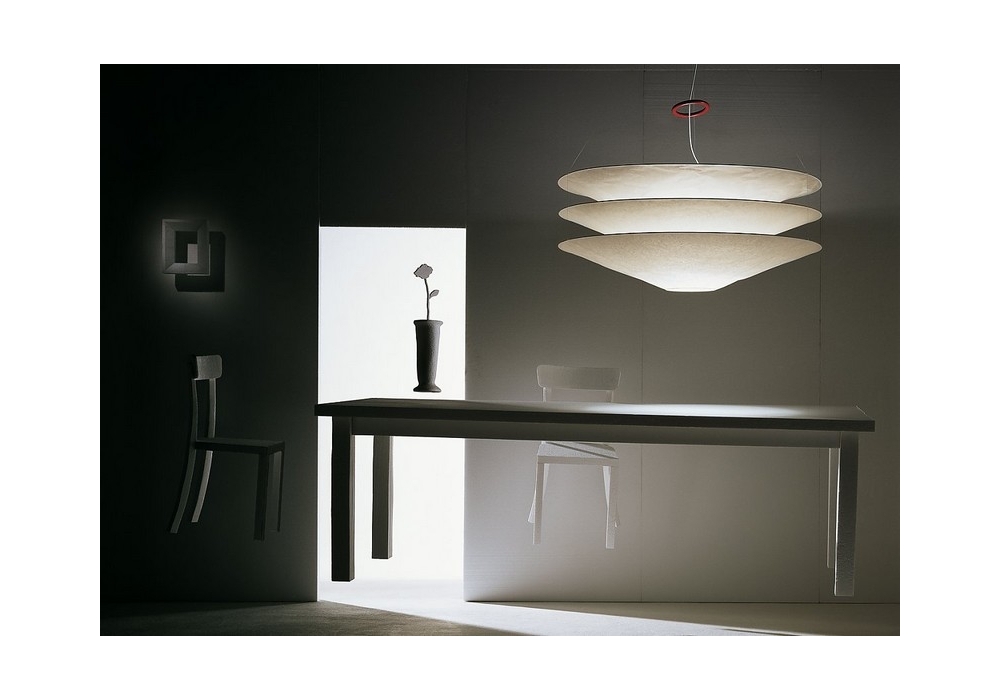 Floatation designed and produced by Ingo Maurer is a suspension lamp with Japanese paper diffuser, available in different sizes. Red iron ring for height adjustment, white painted metal ceiling rose.