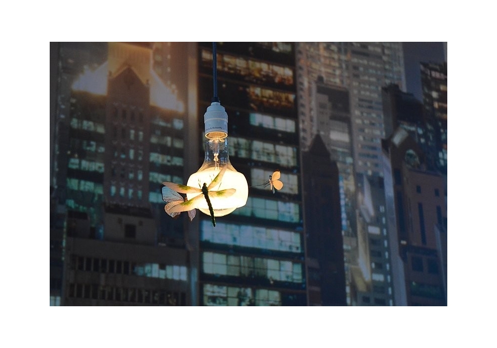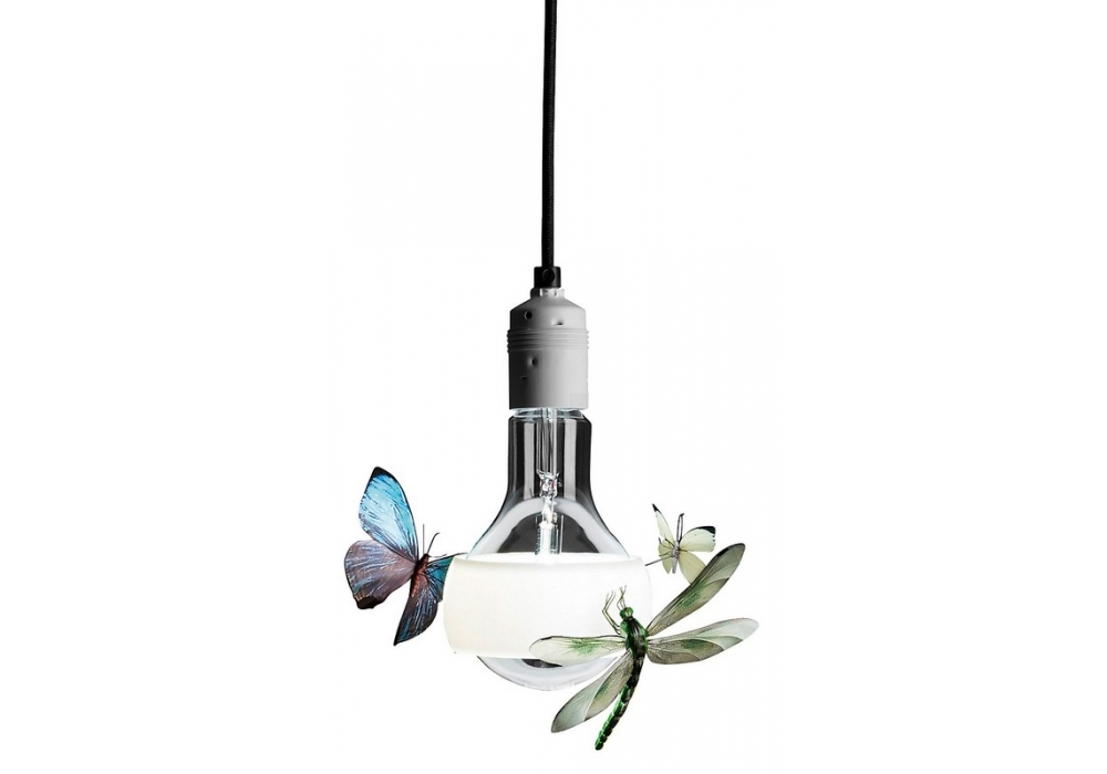 Johnny B. Butterfly is a pendant lamp designed by Ingo Maurer. Bulb with white heat-reasistent PTFE shade. The dragonfly and the two butterflies are hand-made models. With special bulb from stock, produced exclusively for Ingo Maurer GmbH.