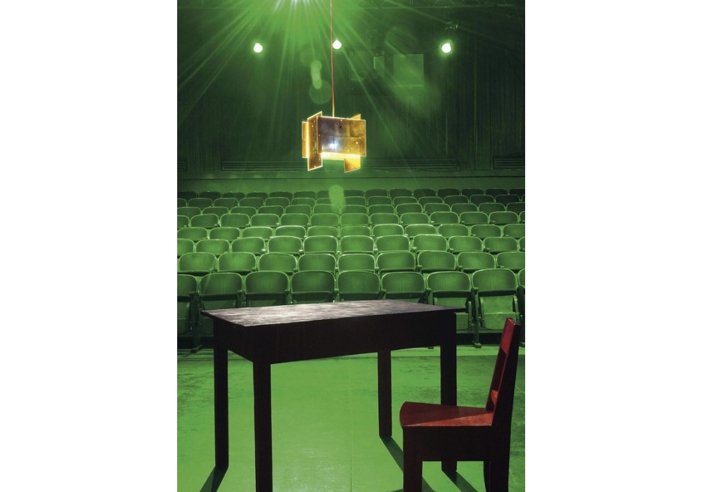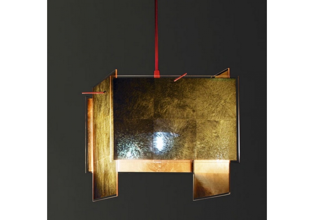 24 Karat Blau designed by Axel Schmid for Ingo Maurer is a suspension lamp with metal structure and diffuser composed of 4 plates with gold leaf fused in acrylic glass. The fixtures of the luminaire each have 4 holes with which they can be hung on the red cross of the rod at different angles, in portrait or landscape format. The 24-karat blue trim is individually handcrafted.