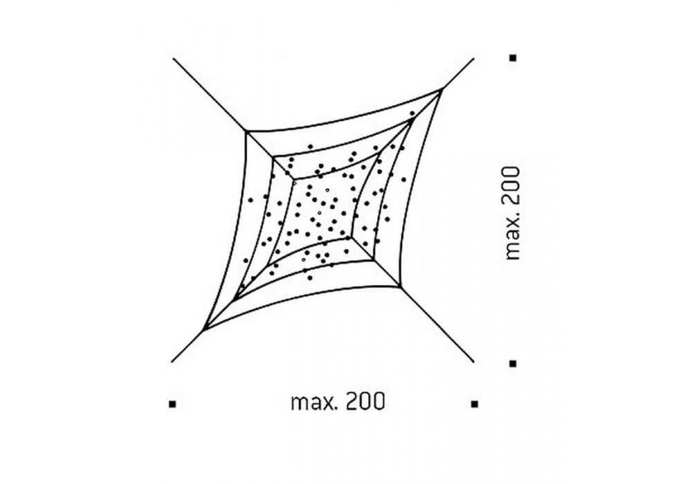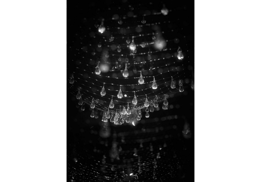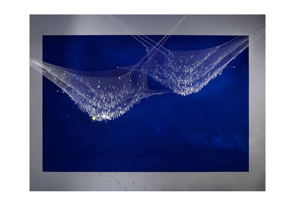 Lacrime Del Pescatore designed and produced by Ingo Maurer is a suspension lamp whose structure is made up of 3 nylon nets of different sizes, with the application of 385 crystals. The bulb, Ø 11 cm, is attached to the wall separately.