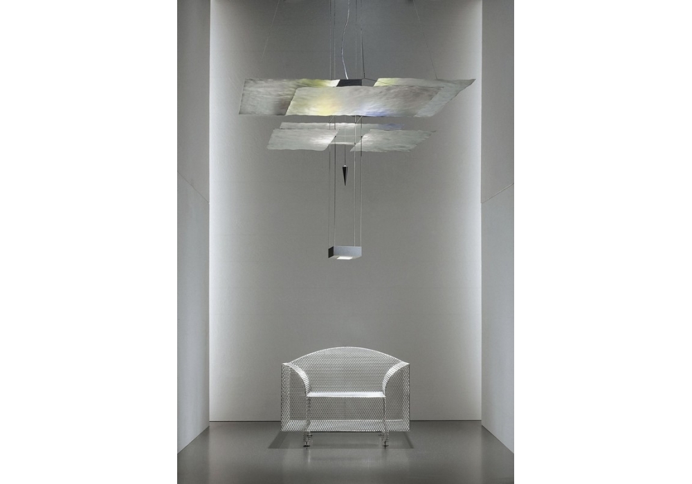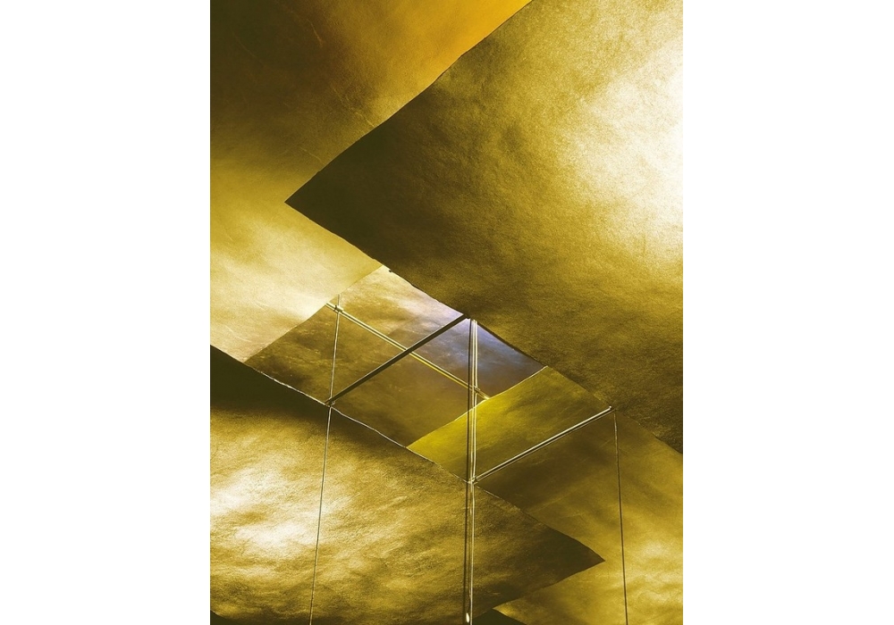 Oh Mei Ma Kabir signed and produced by Ingo Maurer consisting of six sheets of gilt paper. Plexiglas pendulum. Dimmable, equipped with integrated LEDs. Cable length available in 2 sizes.