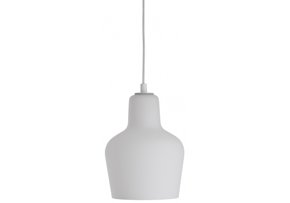 The A440 Pendant Lamp designed by Alvar Aalto for Artek. This sister model of Golden Bell is made of blown glass. Light disperses through the opal glass evenly, without glare. Etched satin opal glass, white painted fittings.