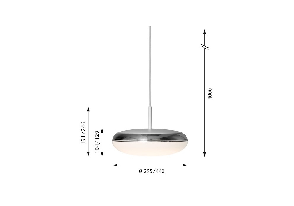 Silverback designed by KiBiSi for Louis Poulsen is a pendant lamp with circular supporting structure in white powder coated die-cast aluminum. The diffuser is in plain PMMA and semi-metallic polycarbonate and shields a Dali dimmable LED light source. Silverback is available in different sizes.