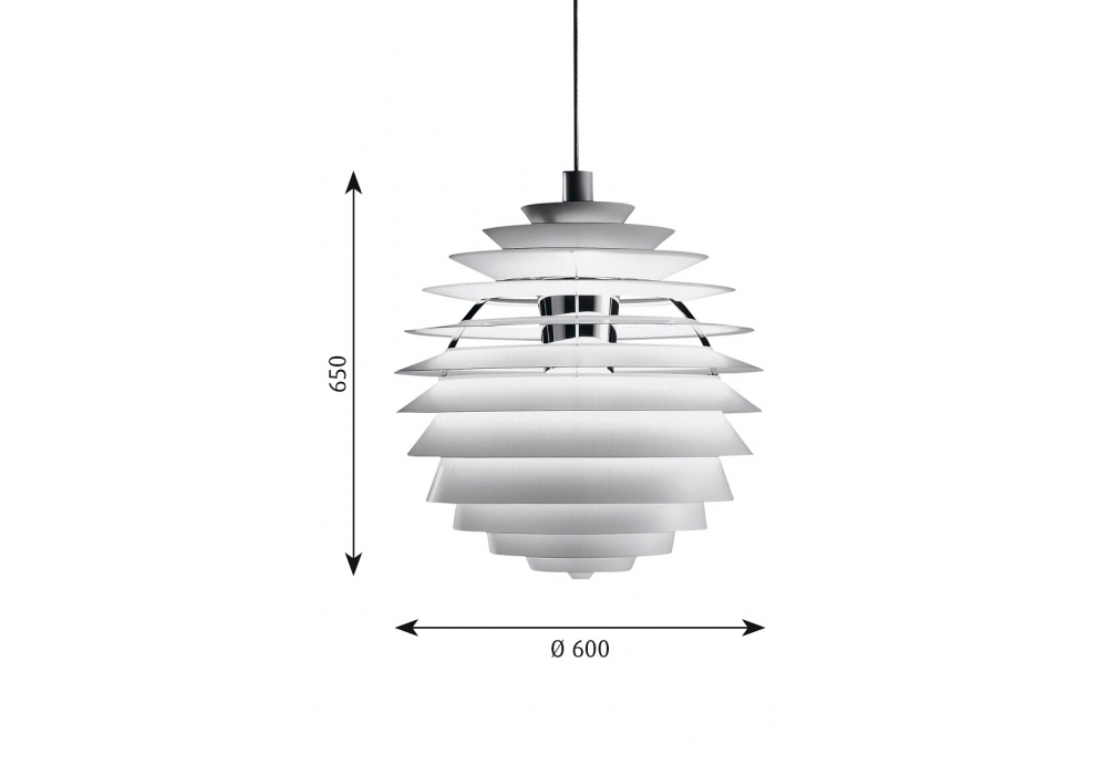 PH Louvre designed by Poul Henningsen for Louis Poulsen is a circular pendant lamp with supporting structure in chromed extruded brass and drawn aluminium. The diffusers are in white painted aluminum and shield a LED-type light source in different types of dimmability and light source gradation.
