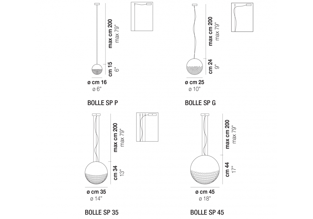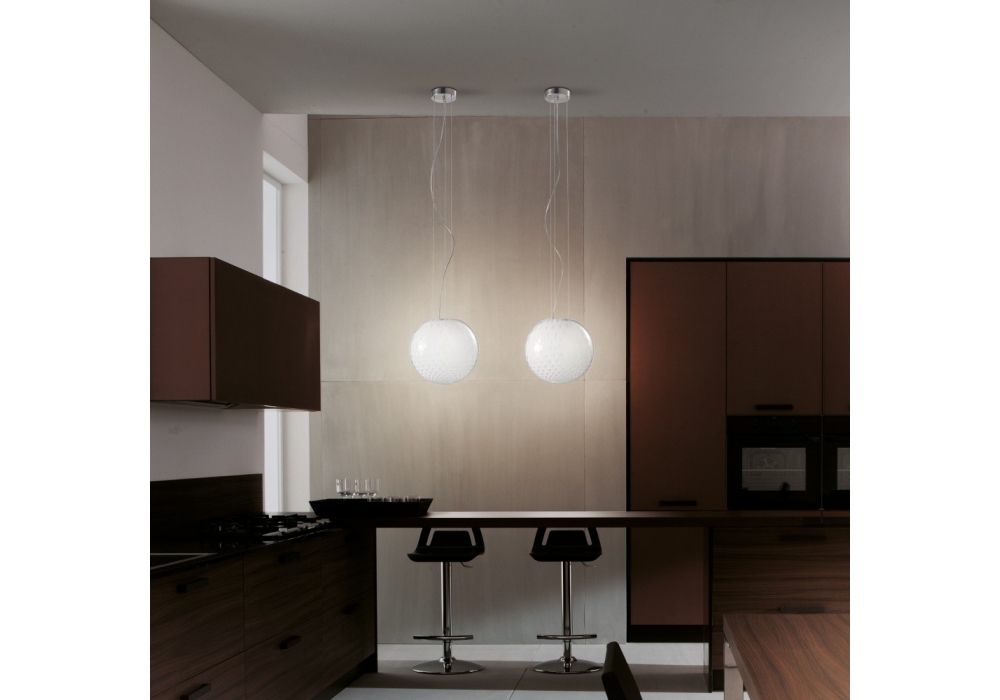Bolle designed by Barbara Maggiolo for Vistosi is a pendant lamp with supporting structure in nickel-coloured painted metal. The diffuser is in spherical glass with an irregular surface in the white/bubble or crystal/bubble finish. The light source is halogen dimmable in different shades of light. Bolle is available in different models.