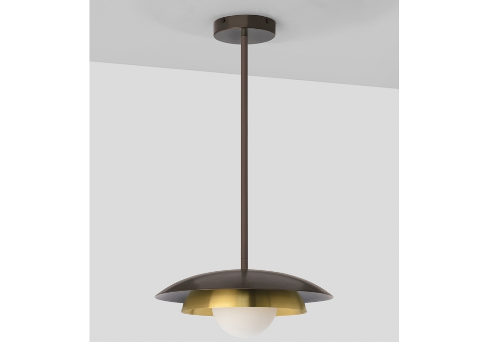 Carapace designed by CTO Lighting is a pendant lamp made of bronze and satin brass, lampshade in opaline glass and structure with rod or with bronze oval chain/black flex.