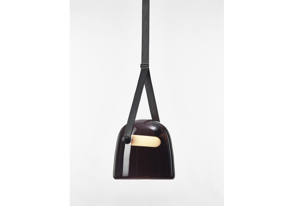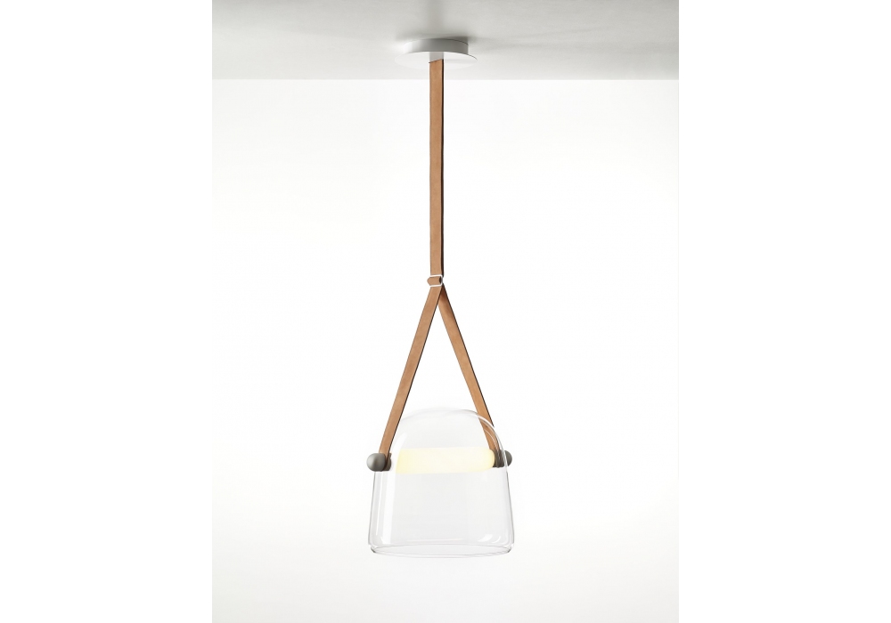 Mona Medium designed by Lucie Koldová for Brokis is a pendant lamp with a blown glass diffuser supported by a leather strap. The light source used is a dimmable LED module in different versions. Mona Medium is available in different finishes.