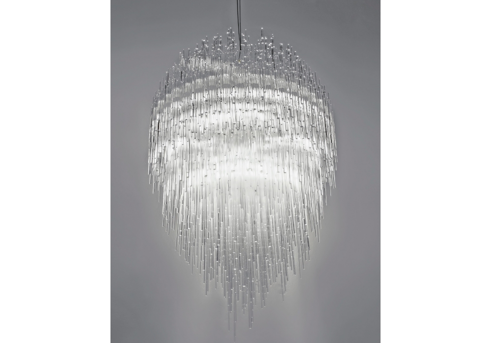 Iceberg designed by Dodo Arslan for Terzani is a pendant lamp with metal supporting structure and more than 3600 plexiglass elements. The light source used is of the dimmable LED type.