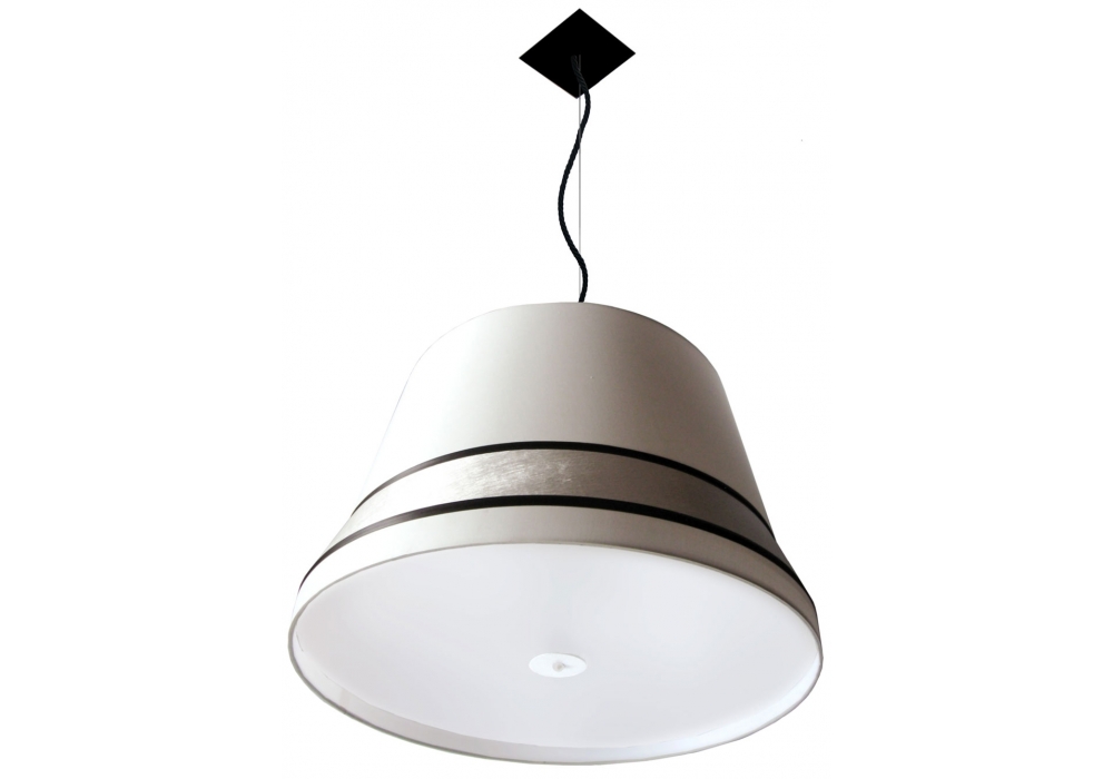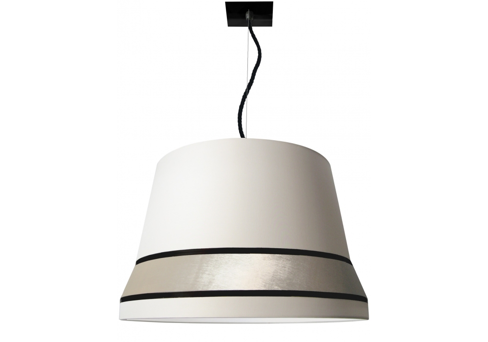 Audrey designed by Massimiliano Raggi for Contardi is a pendant lamp with a quadrangular rosette and metal supporting structure. The lampshade is circular in shape in fabric embellished with inserts in fabric of other colors. The light source adopted is with an E27 LED type socket. Audrey is available