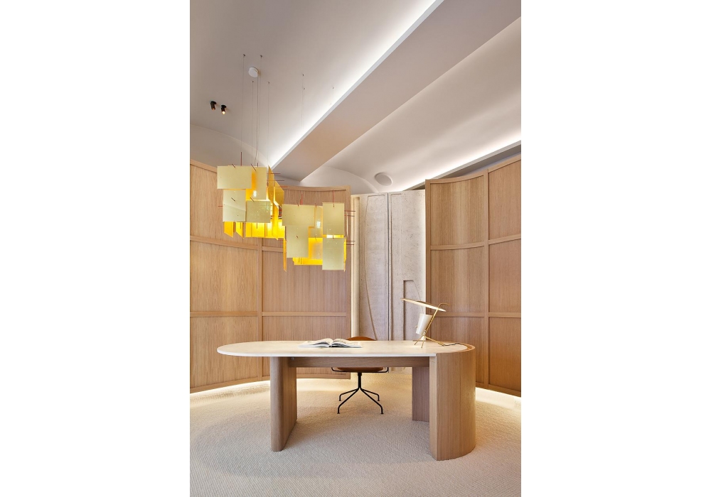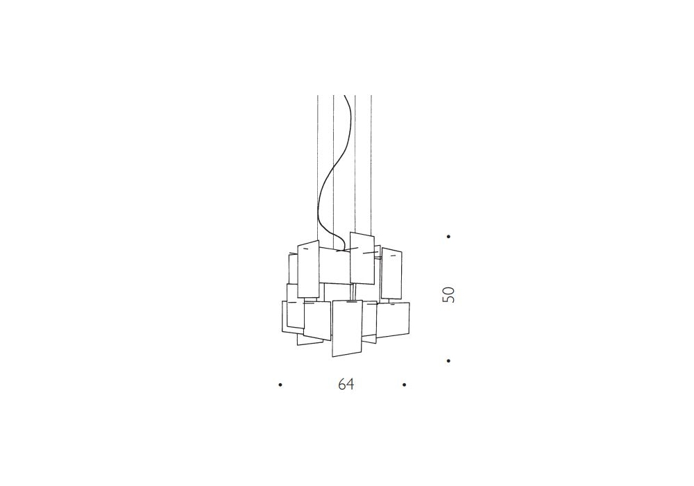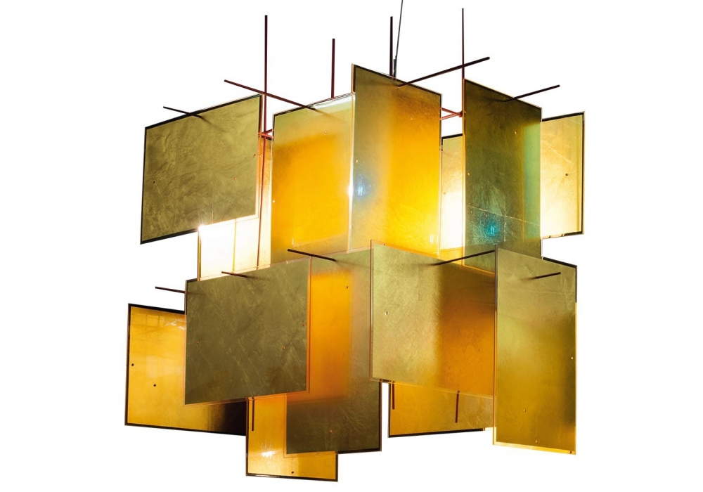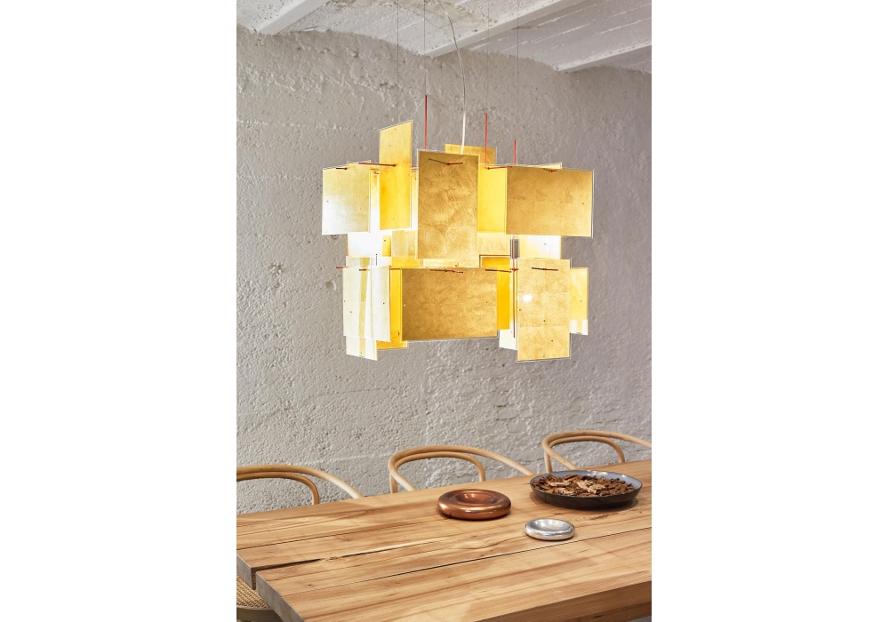 1000 Karat Blau designed by Ingo Maurer is a pendant lamp. with 20 lampshades. The shades, made of gold leaf and acrylic glass, reflect the light again and again and create an extraordinary warm atmosphere. Metal-framework in Red.
