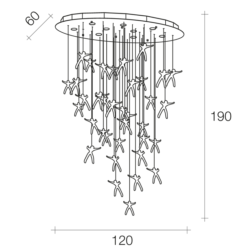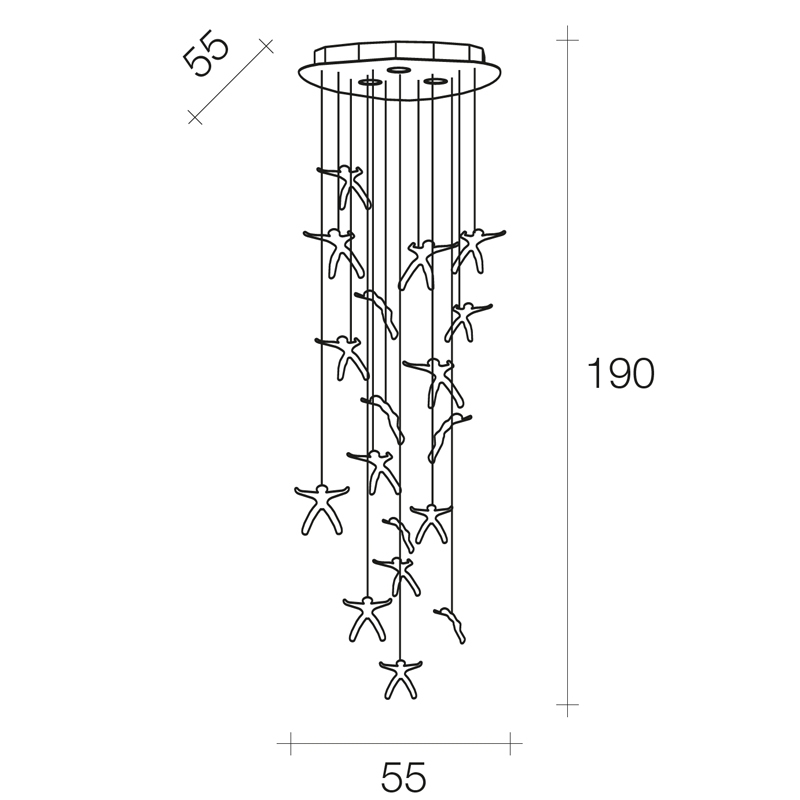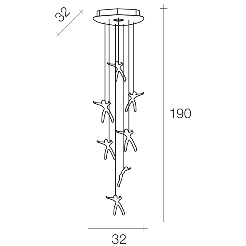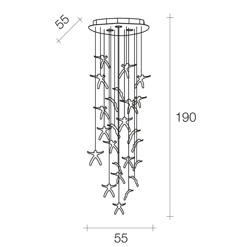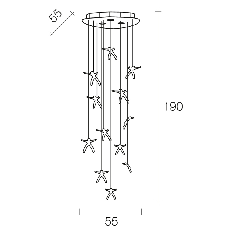| Ceiling rose | 32 x 32 x H 7,5 cm (7 pendants); 55 x 55 x H 7,5 cm (12 pendants); 55 x 55 x H 7,5 cm (18 pendants); 55 x 55 x H 7,5 cm (24 pendants); 12 x 60 x H 7,5 cm (36 pendants). |