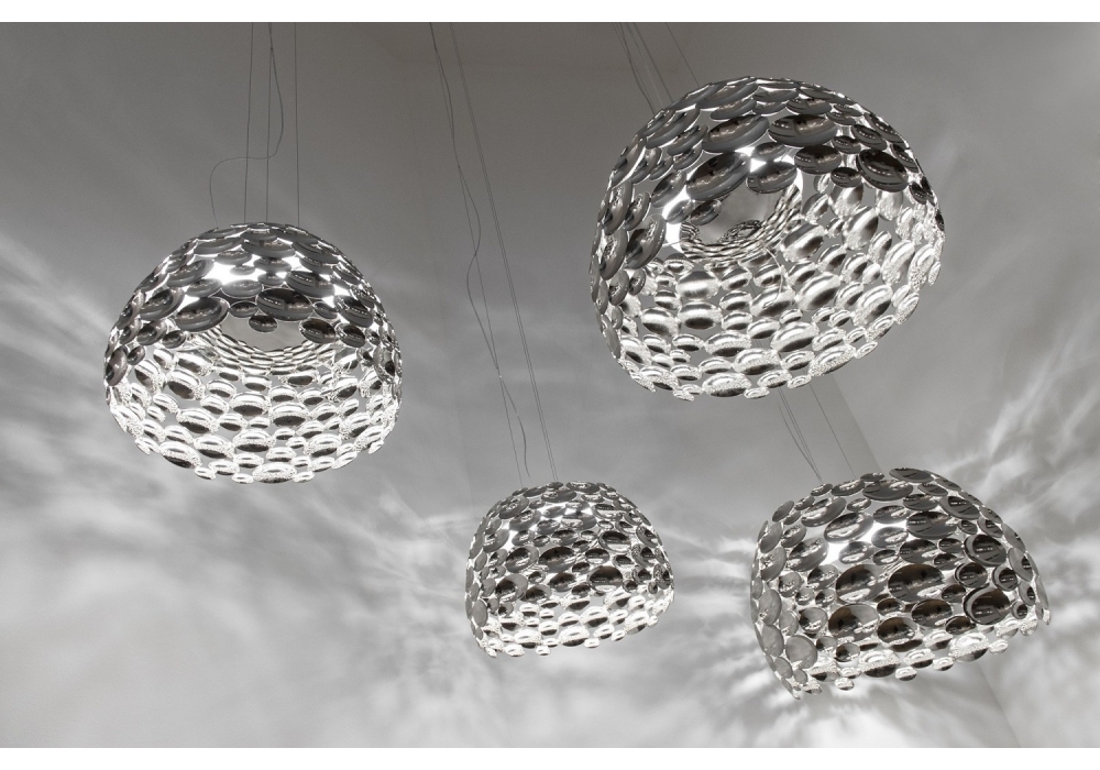 Anish designed by Dodo Arslan for Terzani is a pendant lamp with a circular shape structured by multiple applications in metal with a nickel finish. The light source adopted is of the LED dimmable type in different versions and gradations of light. Anish is available in different designs.