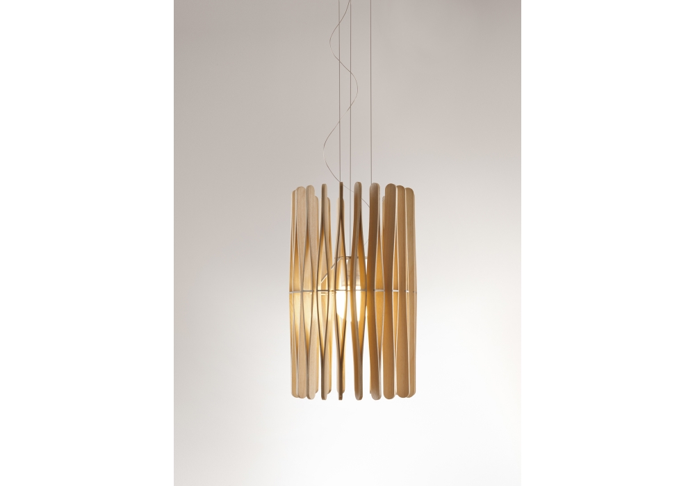 Stick F23 designed by Matali Crasset for Fabbian is a suspension lamp characterised by its innovative design. The light is discreetly diffused from a frame decorated with laths of Ayous wood. Also available in 5 types with different light sources. Protection Index IP 20.