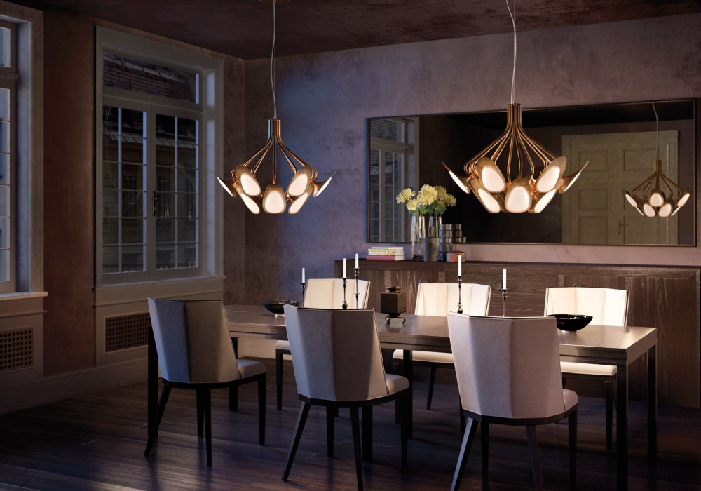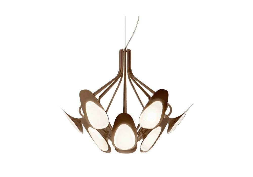 Peacock designed by Noé Duchaufour Lawrance for Kundalini is a pendant lamp with twelve arms, curved white cased glass shade and structure with body and canopy in steel, powder lacquered or acid-etched brass.