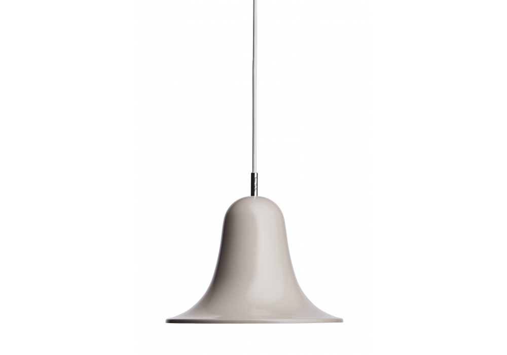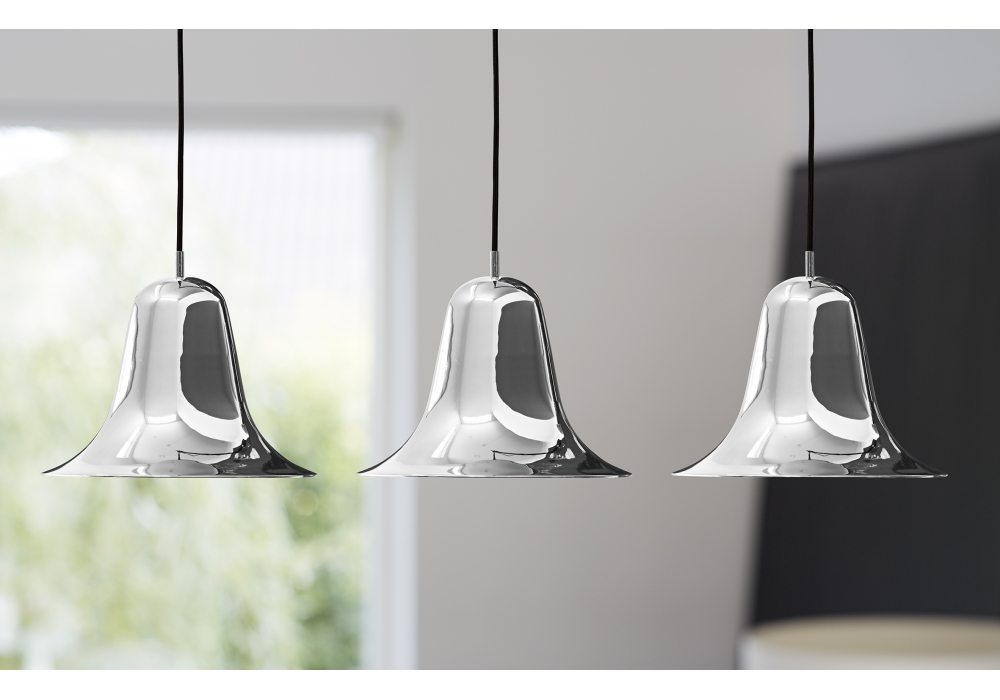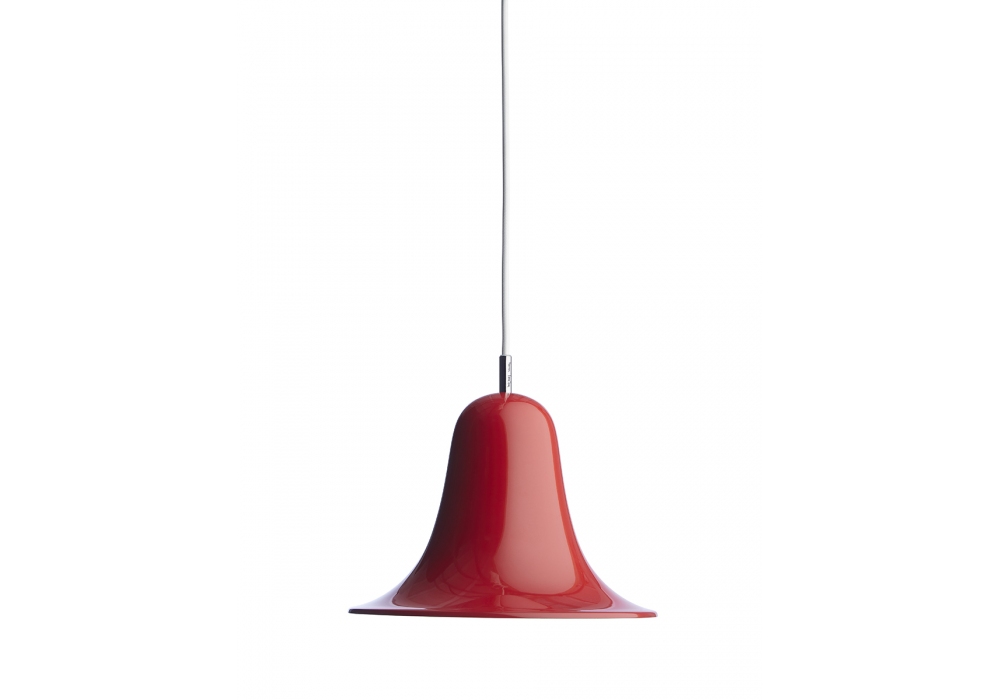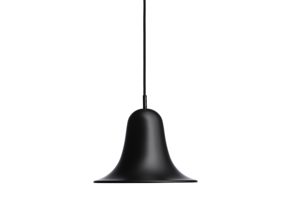 Pantop designed by Verner Panton for Verpan is a suspension lamp with bell-shaped lampshade made of metal. Rosette in PVC and suspension cable in fabric in black or white depending on the finish of the lampshade. Available in different finishes.