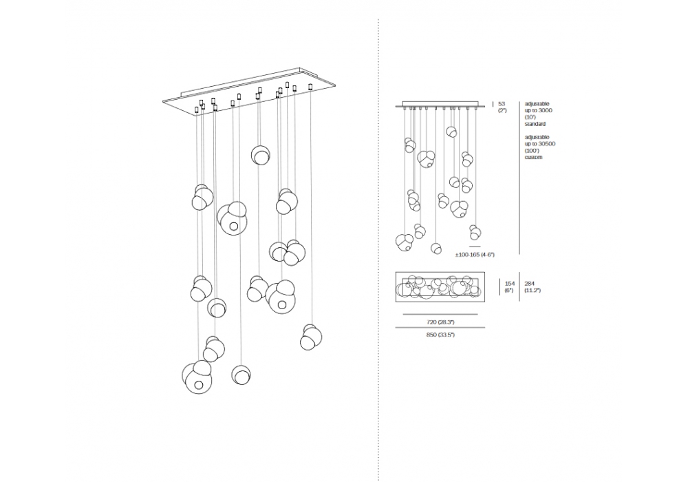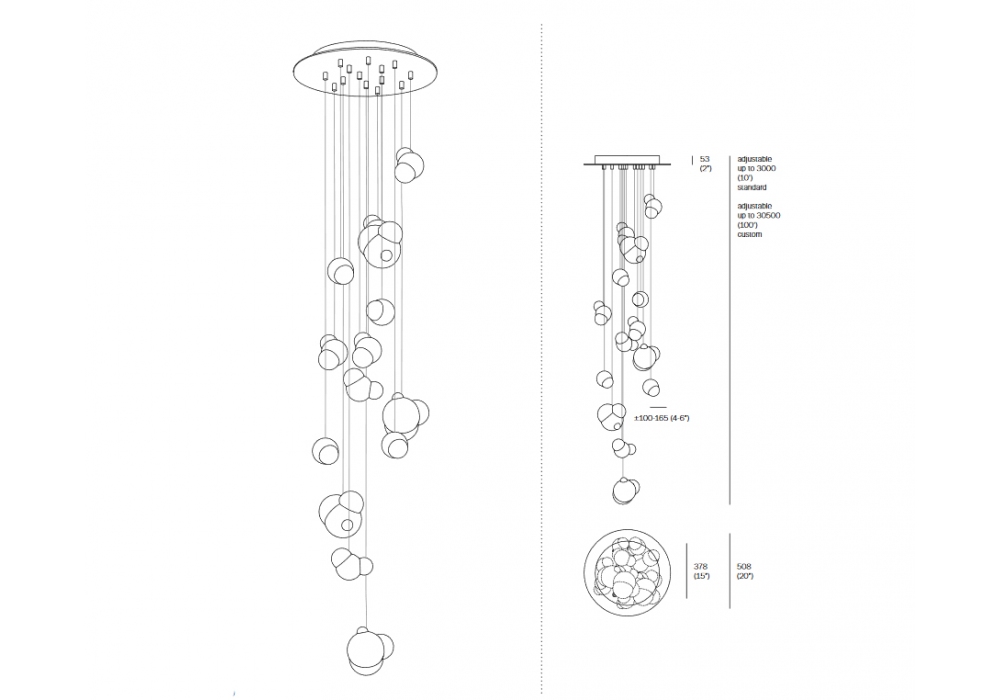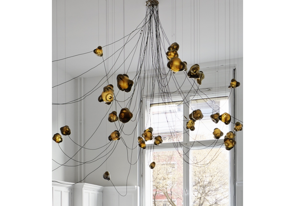 57.14 designed by Omer Arbel for Bocci is a suspension lamp with fourteen diffusers. The 57 series is a collection of suspension lamps in which each pendant is the result of an innovative manufacturing technique that makes the product unique in terms of materials and shape. It consists in the trapping and injection of air inside the molten glass components which subsequently join together. A combination of innovation and craftsmanship. Available in three versions: Rectangle, Round or Round decentralized and four different diffusers.