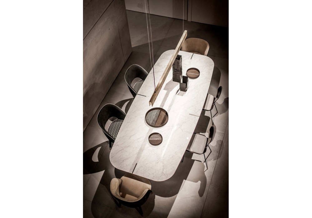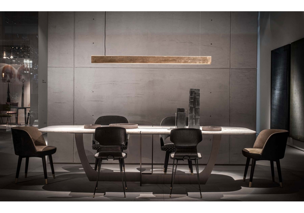 Blade designed by Baxter P. for Baxter is a beautiful LED suspension lamp with satin-finish brass frame.