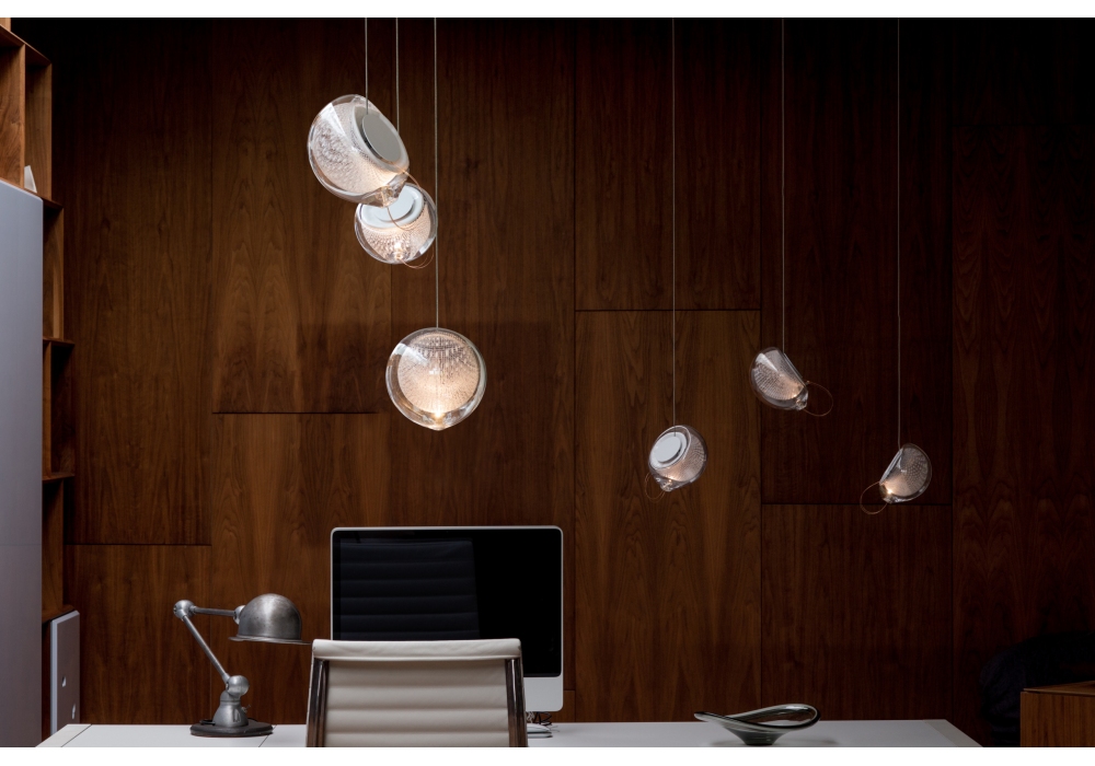 The 76 series designed by Omer Arbel for Bocci is a pendant lamp available in different configurations. A copper mesh is inserted into a vacuum between a layer of transparent glass and another of white glass. The white glass thanks to the vacuum filtering through the wire mesh creating this characteristic effect.