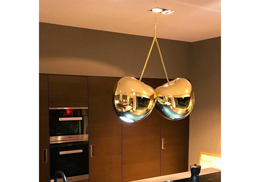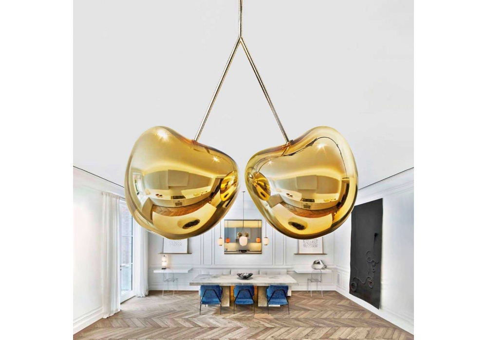 Cherry designed by Nika Zupanc for Qeeboo is a pendant lamp realized with hand blown glass and metal frame/brass. Simple in design and generous in their final effect, they enable many combinations that derive from very rudimentary moves. Available in different finishes.