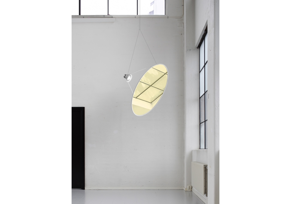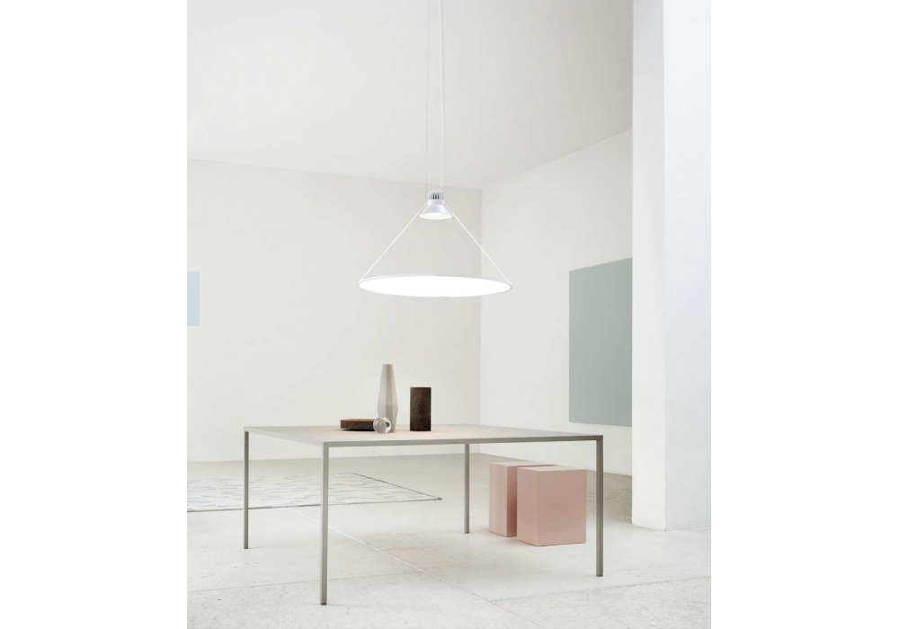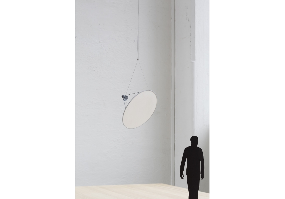 Amisol designed by Daniel Rybakken for Luceplan is a pendant lamp adjustable in space. The structure is in white aluminum equipped with a Ø 75 cm or Ø 110 cm plastic disc available in three finishes. It is possible to add the anti rotation accessory.