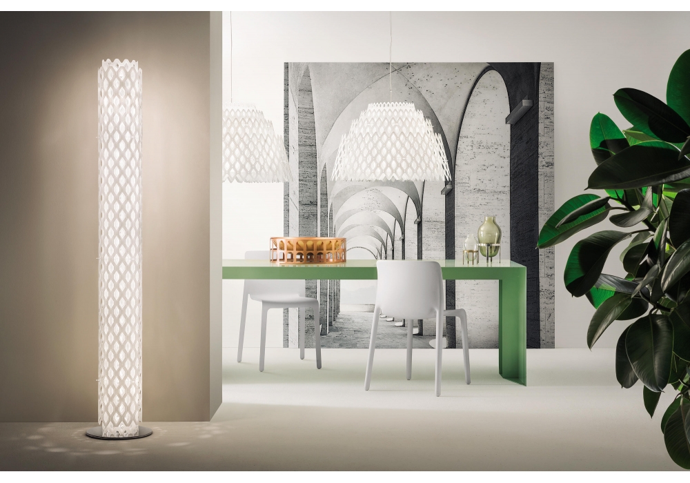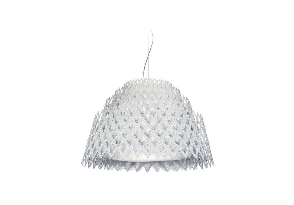 Half Charlotte designed by Doriana and Massimiliano Fuksas for Slamp is a pendant lamp with a circular shape with concentric circles, entirely structured in white Cristlaflex and Lentiflex. The light sources adopted are of the dimmable filament LED type.