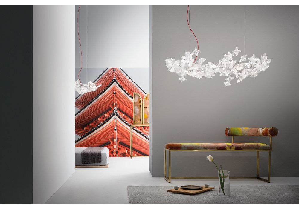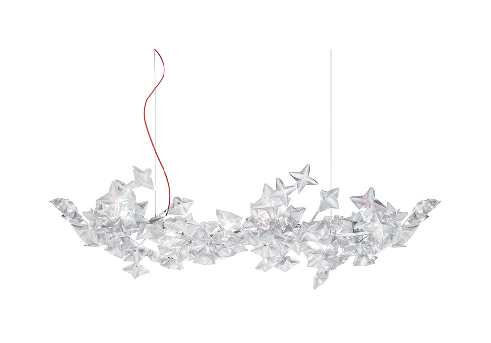 Hanami designed by Adriano Rachele for Slamp is a suspension lamp entirely made of Lentiflex, polycarbonate and stainless steel. The light source used is a dimmable LED type with a red or transparent power cable. Hanami is available in different sizes.