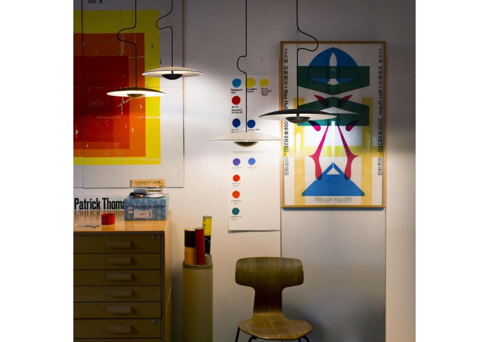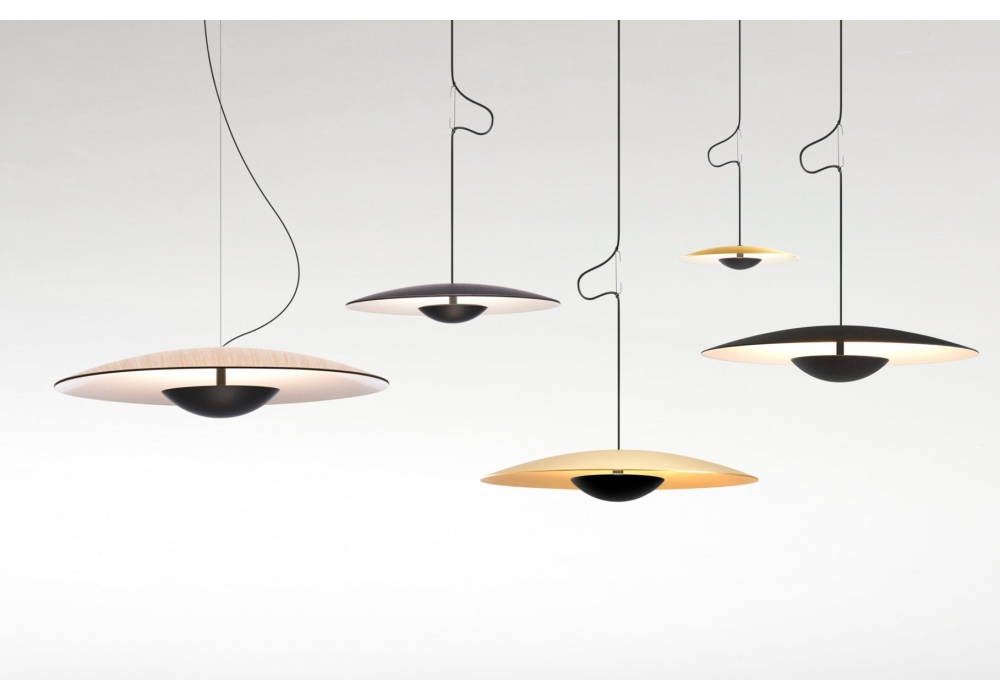 Ginger designed by Joan Gaspar for Marset is a pendant lamp with 4mm pressed wood diffuser in natural oak or wengé or in brushed aluminium. Available in different finishes and sizes.