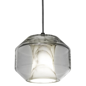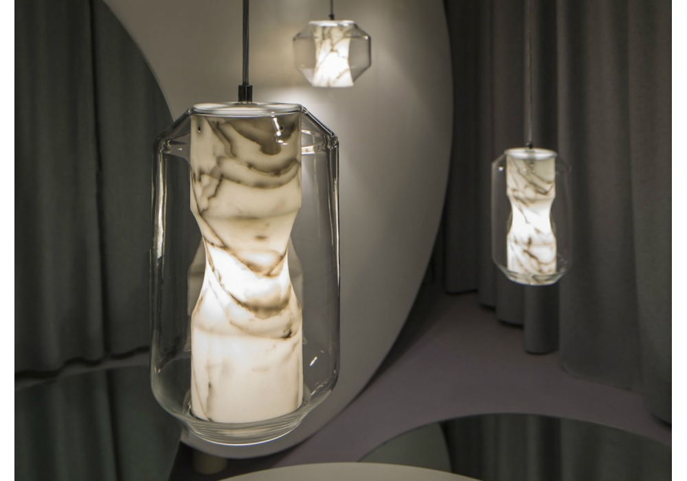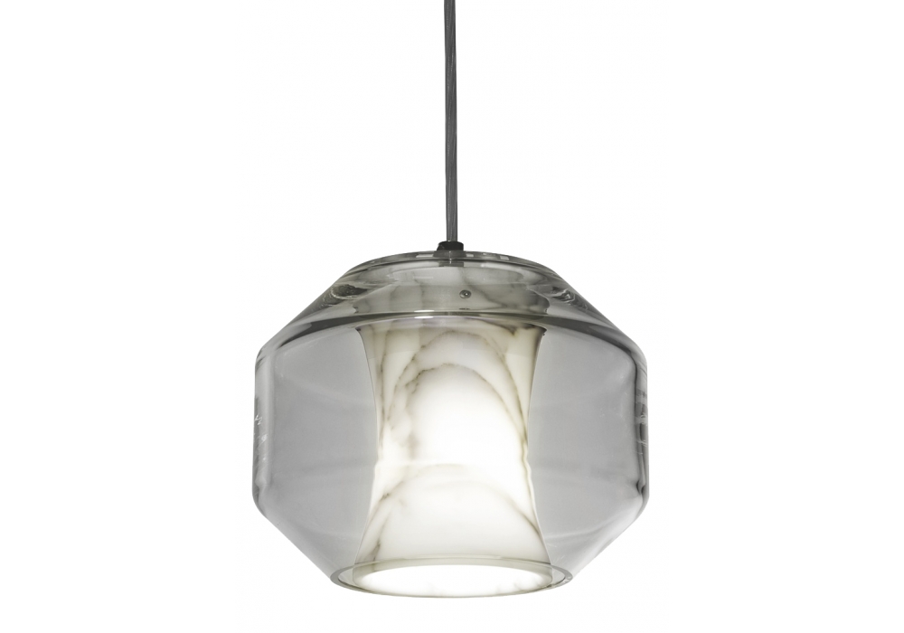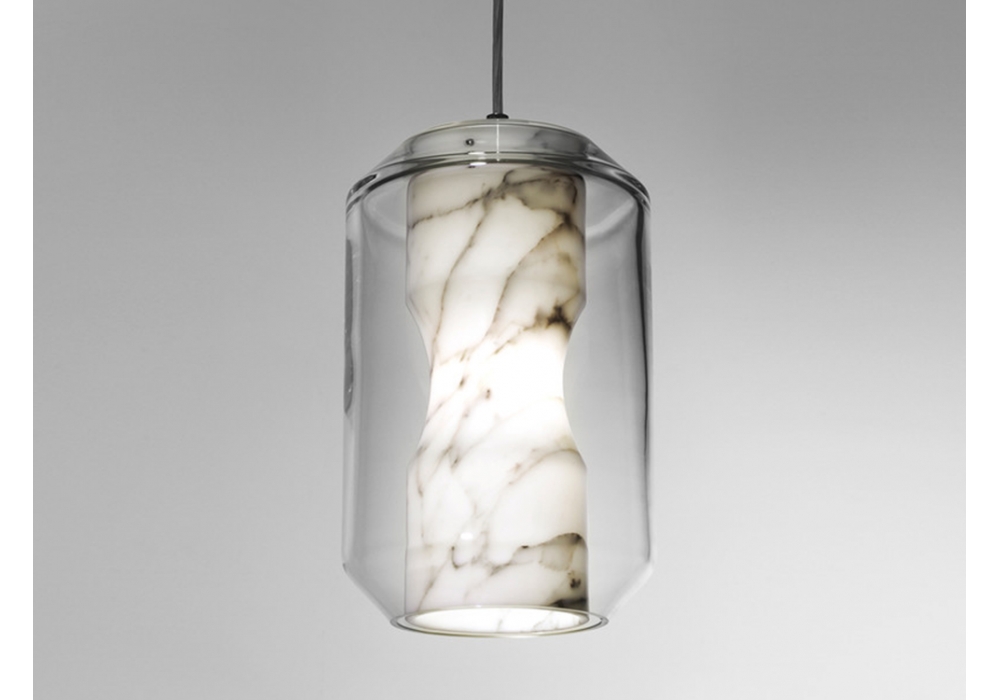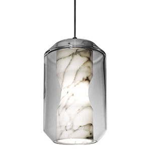 Chamber designed by Lee Broom is a pendant lamp with a sculptural Carrara marble diffuser within a lead crystal vessel. It expresses the unexpected translucent qualities of marble in a compelling decorative pendant. With its gentle luminosity and directional downlight, Chamber is available in two dimensions and lends itself to being hung in clusters as well as individually. Clear cable of 300 cm. Satin white metal ceiling rose 12 cm round.