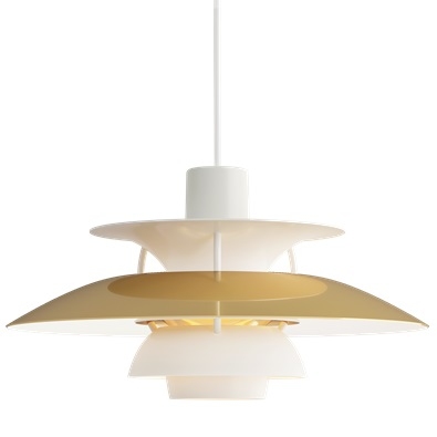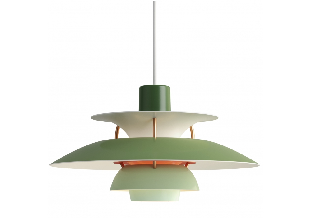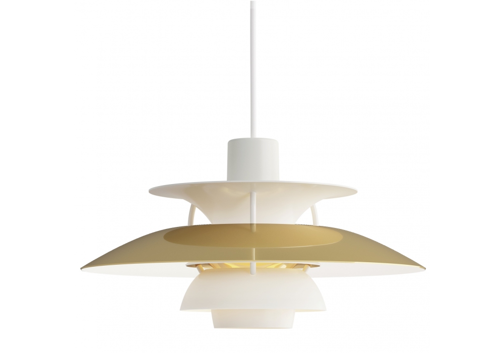 PH5 Mini designed by Poul Henningsen for Louis Poulsen is a pendant lamp with supporting structure in painted laminated aluminum. The diffusers are in aluminium, copper or brass and shield a LED or halogen light source with E14 fitting. PH5 Mini is available in different finishes.