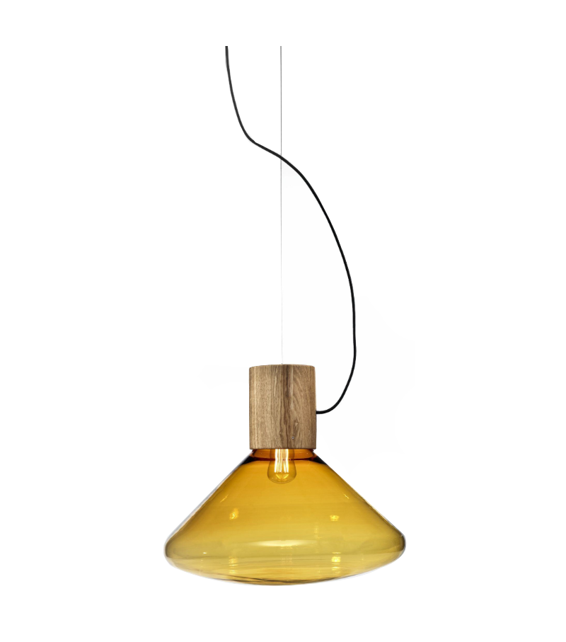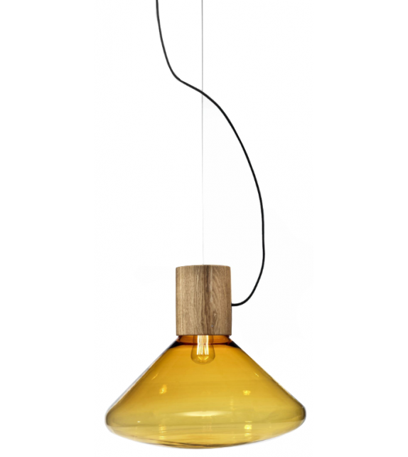 Muffins Wood 03B designed by Dan Yeffet and Lucie Koldová for Brokis is a suspension lamp with shaded glass diffuser in different colors. The supporting structure is cylindrical in oak or walnut and is treated or painted in different finishes. The light source adopted is of the dimmable LED type.