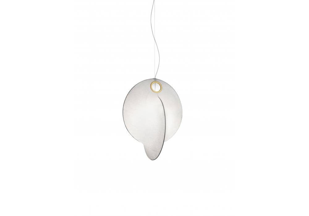 Overlap designed by Michael Anastassiades for Flos is a pendant lamp with diffused light. Internal structure in white powder-coated steel. Cocoon resin diffuser sprayed onto the structure, with transparent protection, sprayed at the end of the process. Ring for replacing light bulbs printed in steel, Polished and Gold «Galvanic» finish. Die-cast Zama ceiling rose with Polished and Gold «Galvanic» finish. Remotely adjustable (dimmer not included). Bulb not included.