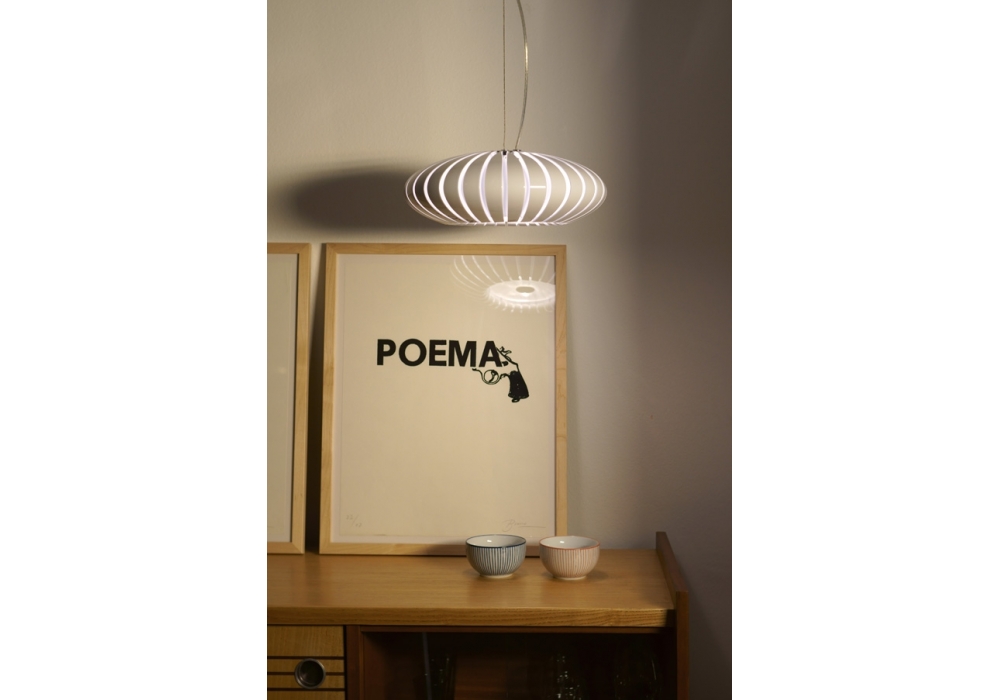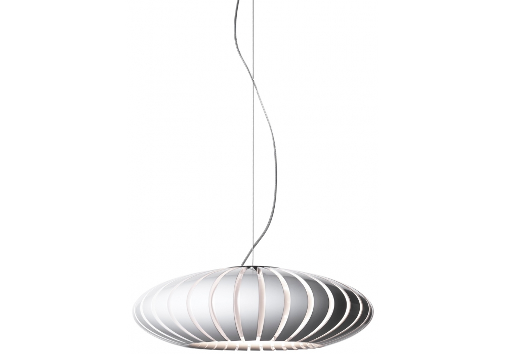 Maranga 50 designed by Christophe Mathieu for Marset is a suspension lamp made of white polycarbonate and chromed metal.