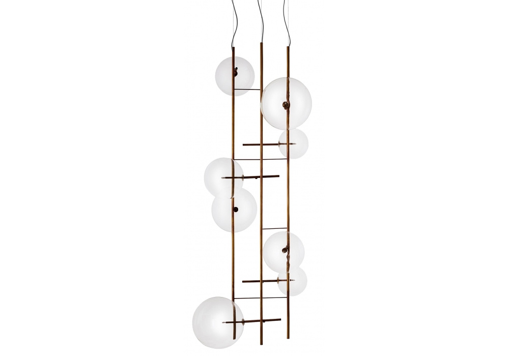 Bolle Tela designed by Massimo Castagna for Gallotti&Radice is a pendant lamp with dimmable LED light. 8 transparent blown glass spheres. Also available version with 6 spheres. Metal parts in hand burnished brass. The hand burnished brass finish looks naturally spotted and irregular. Supplied with cable 4mt long. Supplied with light bulbs (LED).
