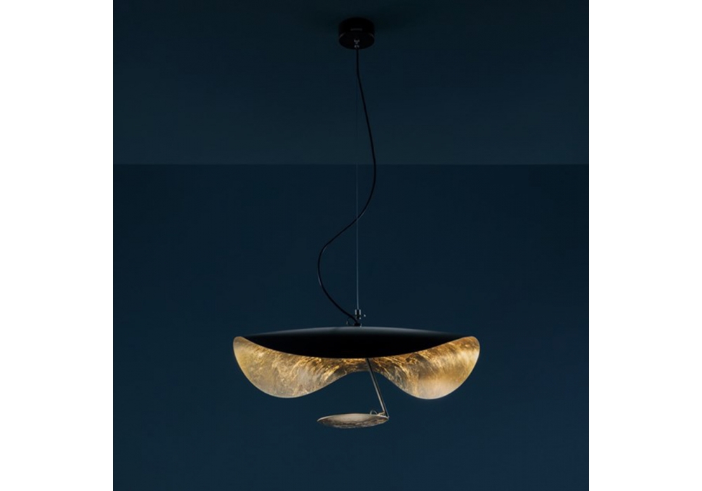 Lederam Manta S2 designed for Catellani&Smith is a pendant lamp with shade and disc made of aluminum. Rod and base in metal. Available in different finishes.
