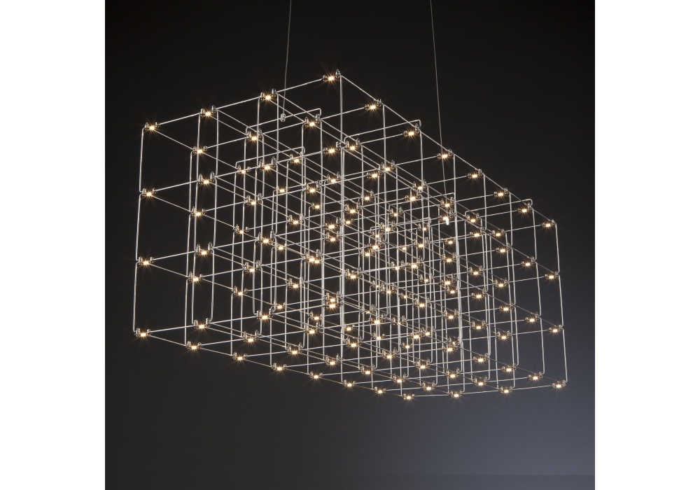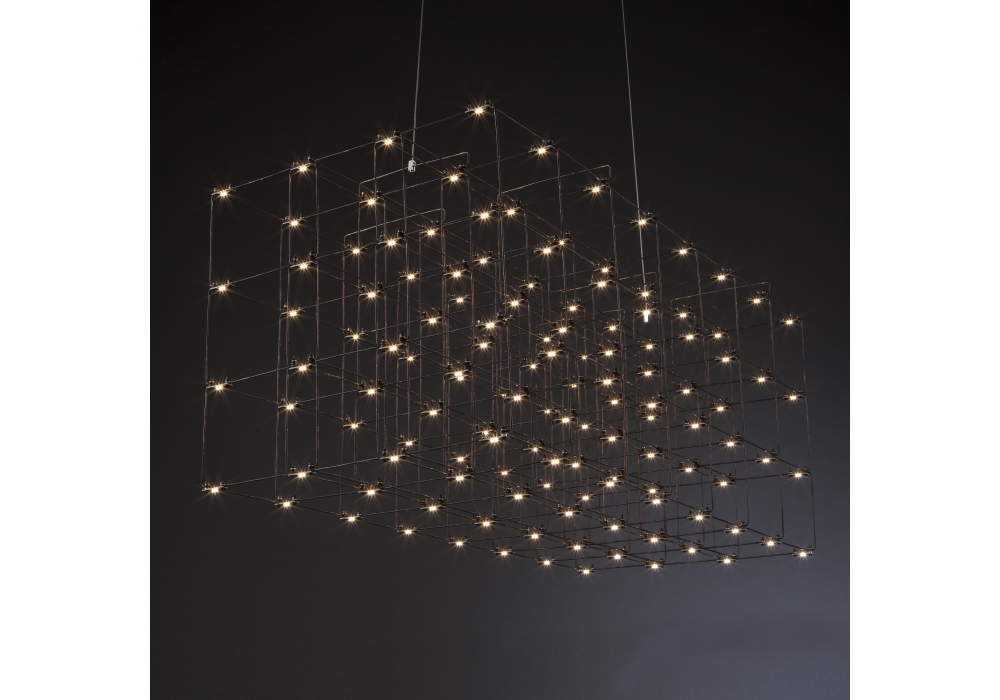 Cosmos Square designed by Jan Pauwels for Quasar is a pendant lamp with a black rosette and a quadrangular lamp body structured by a series of tubular rods anchored to each other. The light sources fixed to the supporting structure are of the LED type. Cosmos is available in different models and finishes.
