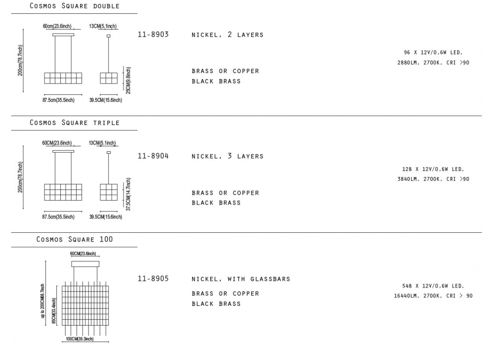 | Ceiling rose | Cosmos Double L 58 x W 39,5 x H 25; Cosmos Triple L 58 x W 20 x H 6; Cosmos Square L 59.5 x W 37 x H 10 |