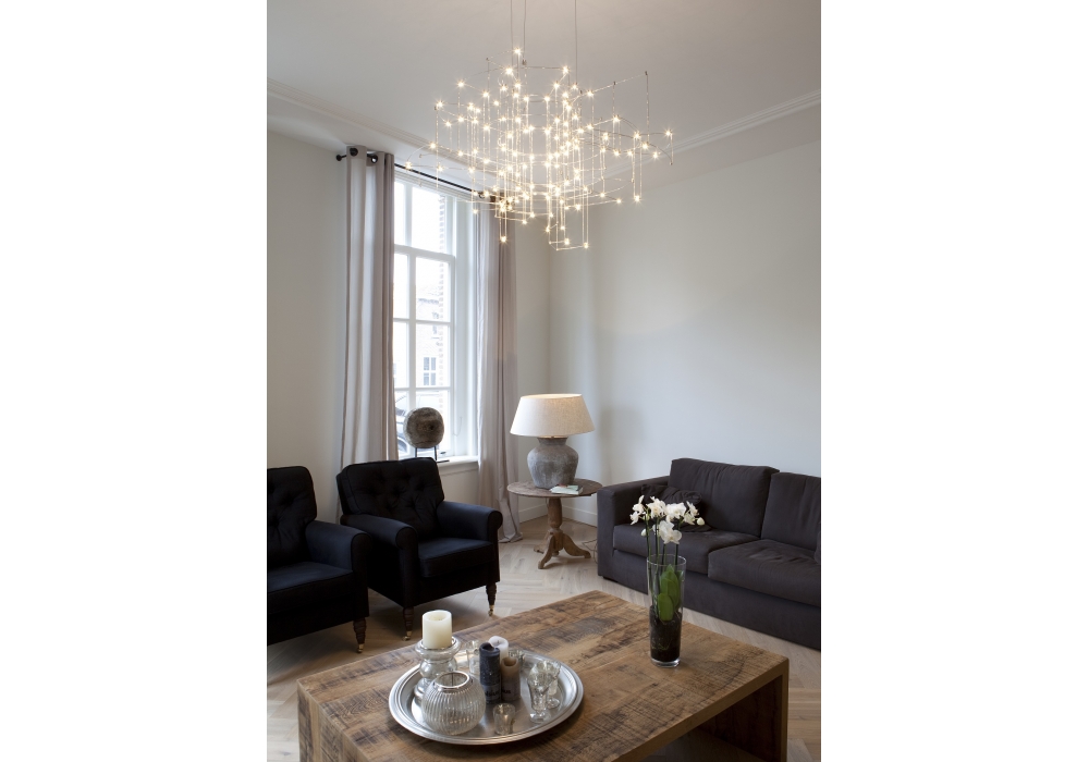 Specter designed by Jan Pauwels for Quasar is a pendant lamp with a black circular rosette and plate in the same finish as the lamp. The lamp body is circular and is structured by several curved metal rods anchored to each other. The light sources adopted are LED type. Specter is available in different sizes and finishes.