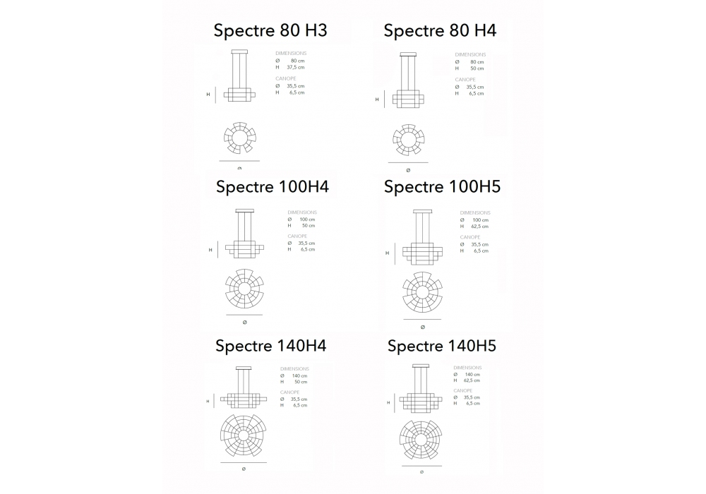 | Dimensions | Ø 80 x H 37,5 cm; Ø 80 x H 50 cm; Ø 100 x H 50 cm; Ø 100 x H 62,5 cm; Ø 140 x H 50 cm; Ø 140 x H 62,5 cm. |