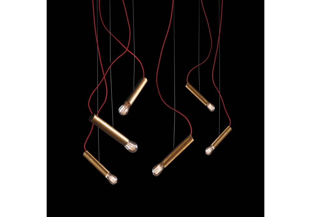 Pipe Light-S designed by Massimo Castagna for Henge is a pendant lamp with a cylindrical body in hand-burnished brass with adjustable inclination. The light source is tungsten made of blown glass. The suspension cable is made of steel covered in red silk.