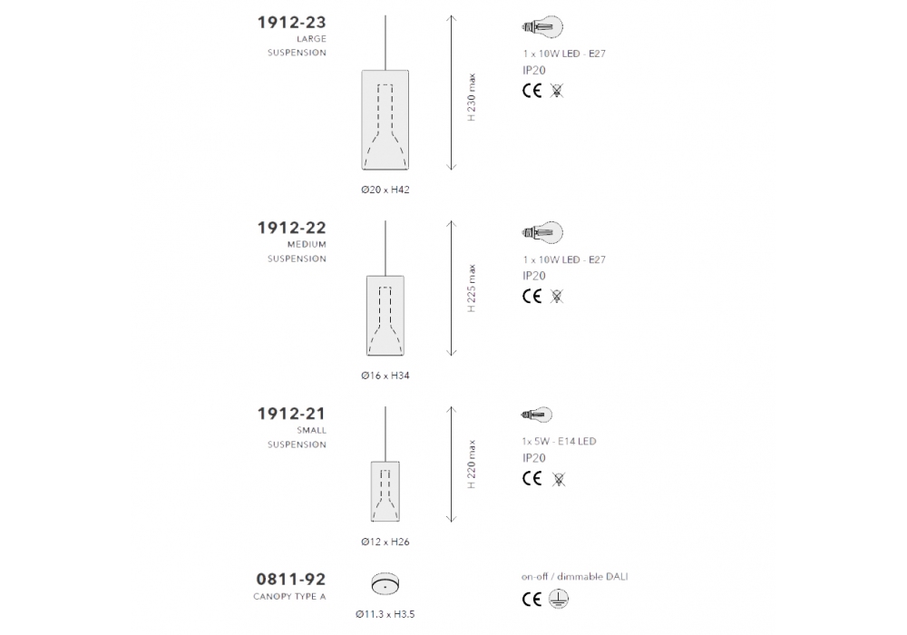 | Dimensions | Ø 12 x H 26 cm (small); Ø 16 x H 34 cm (medium); Ø 20 x H 42 cm (large). |