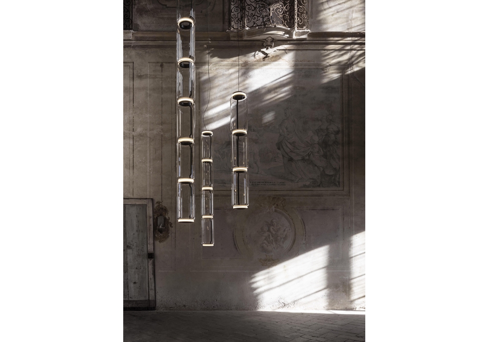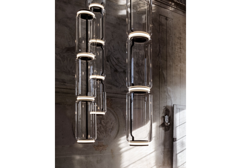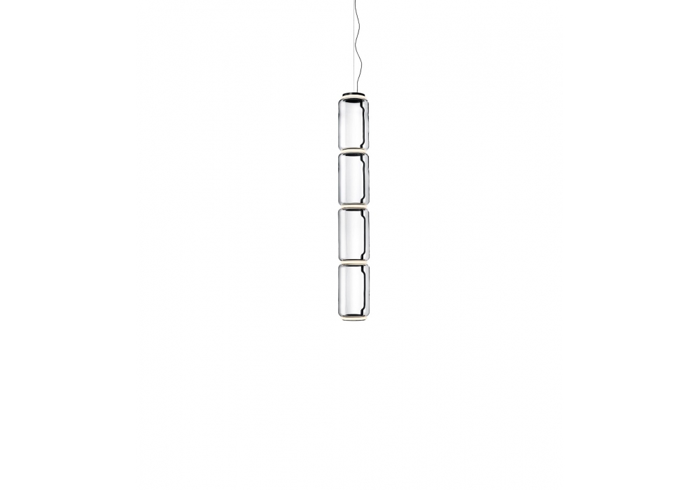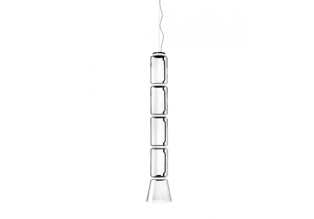 Noctambule designed by Konstantin Grcic for Flos is a pendant lamp composed of glass modules that connect to each other. Cylindrical body and semi-sphere in transparent blown glass, suspension attachment and rings in die-cast aluminum, internal lateral arm in hydroformed steel, and external ring diffusers in injection-molded opal optical silicone. The power supply located in the rosette allows dimming from 10% to 100% and vice versa with 0-10/1-10V, PUSH, DALI control. LED light source included.