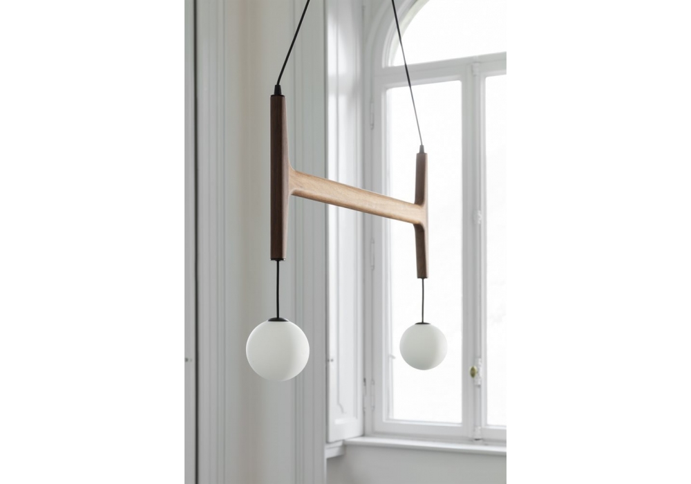 Astra designed by David Dolcini for Porada is a suspension lamp in solid canaletta walnut and diffusers in glossy opal glass. Matt black finish silicone rubber cable. Height of cables adjustable during installation. Ceiling rose and spacer ring in matt black painted metal.