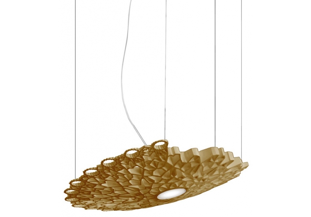 Notredame by Luca De Bono and Dario De Meo is a LED suspension lamp with structure in gold or white technopolymer. Internal use.