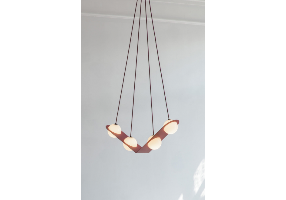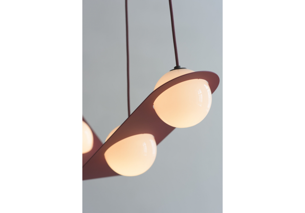 Laurent 02 designed by Lambert&Fils is a suspension lamp with structure in aluminum, steel or painted brass, with cable available in different colors. The diffusers are in opal blown glass. The cables can be parallel or angled.