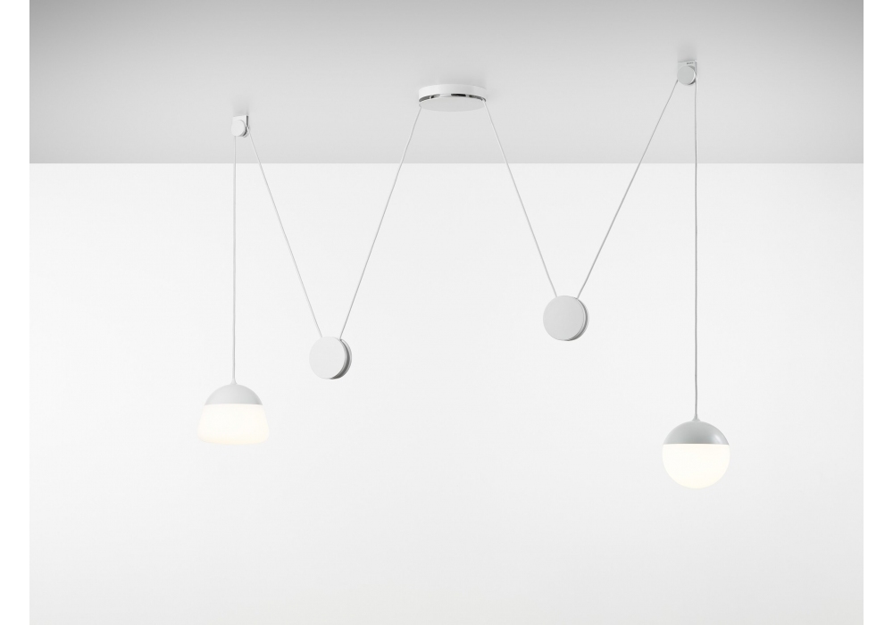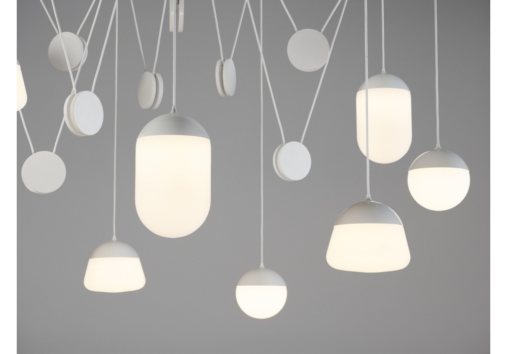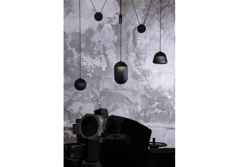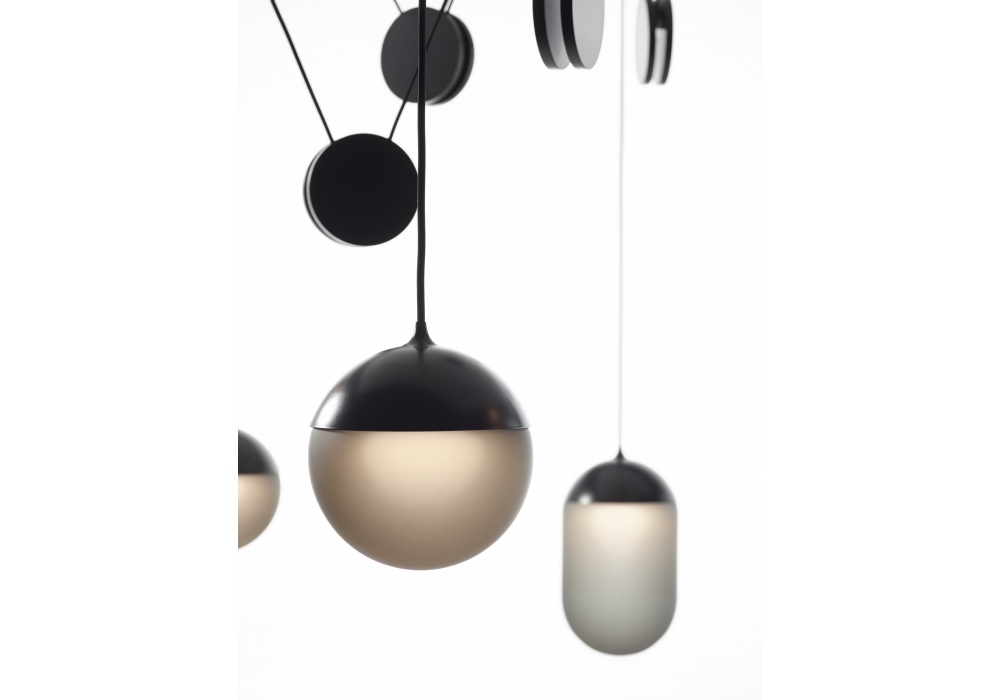 Planets designed by Vrtiška & žák for Brokis is a pendant lamps collection with iron structure in matt black or white powder coating. Glass part is available smoke grey or triplex opal, acid-etched both side surface. Planets is a set of modular lamps at 360 ° in height, size, model and number of diffusers.