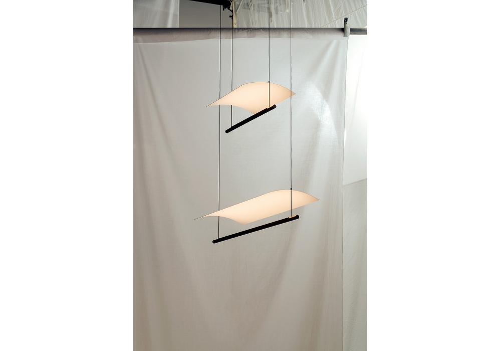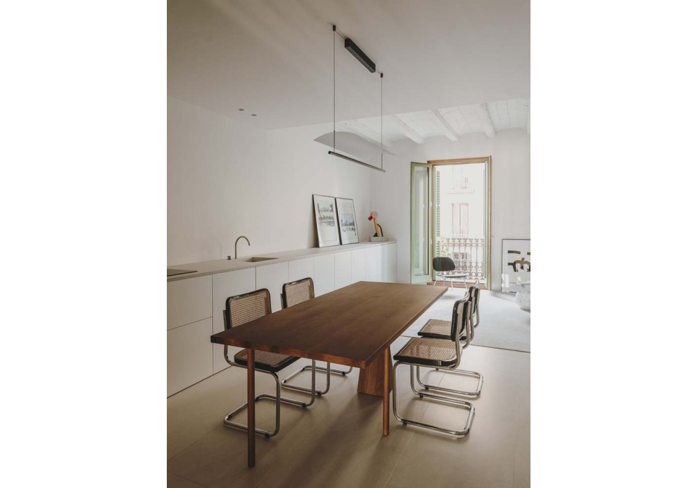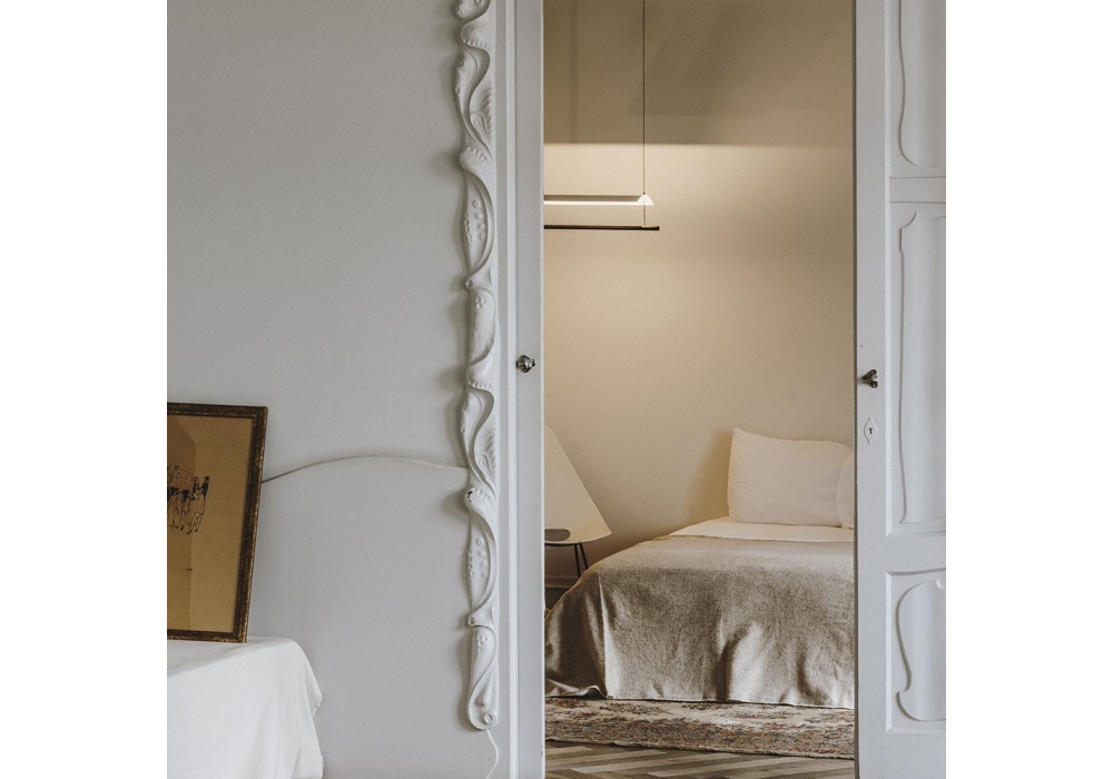 Lamina 45 designed by Antoni Arola for Santa&Cole is a pendant lamp made of white aluminium that gives light upwards.