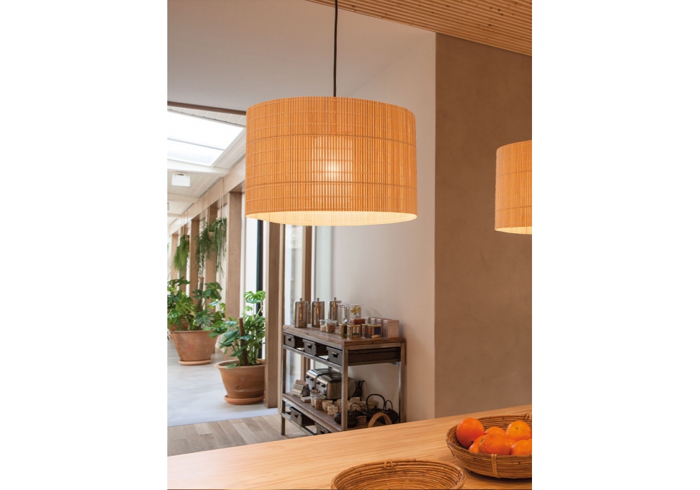 Nagoya designed by Ferran Freixa for Santa&Cole is a pendant lamp with a circular diffuser in wood strip.