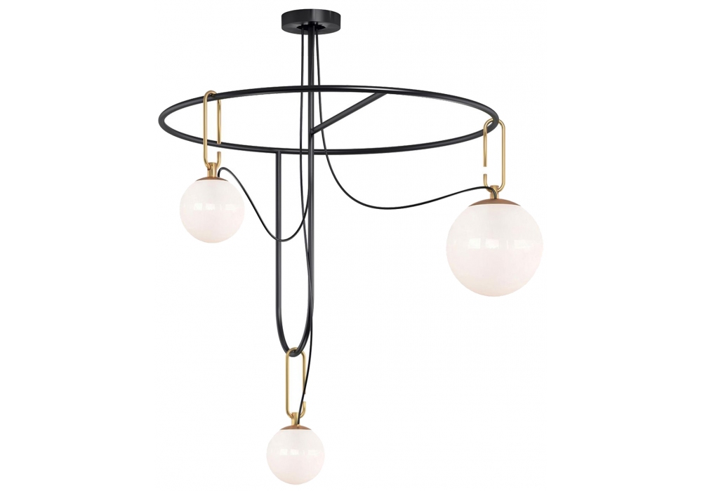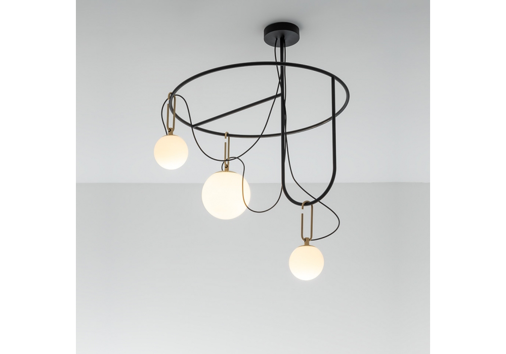 Nh S4 Circulaire designed by Neri&Hu for Artemide is a pendant lamp with circular structure in painted steel. The diffusers are three spherical in shape in white blown glass and shield dimmable LED light sources. Nh S4 Circulaire is available in different finishes.