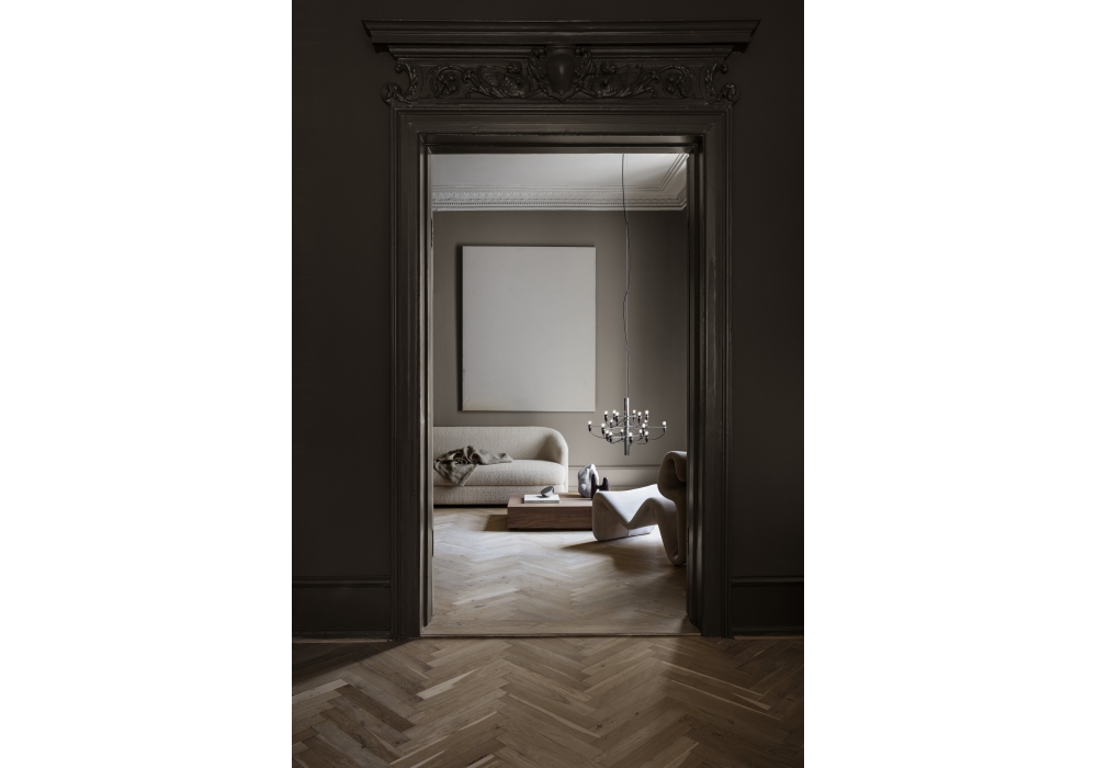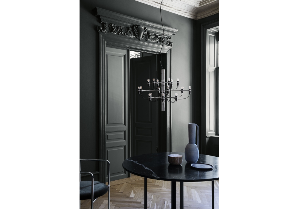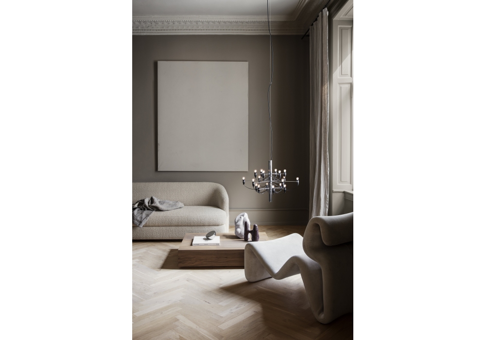 2097/18 designed by Gino Sarfatti for Flos is a pendant lamp with diffused light. Central structure in iron and arms in brass. Ceiling attachment and rose in steel. Remote control (dimmer not included). Bulbs included.